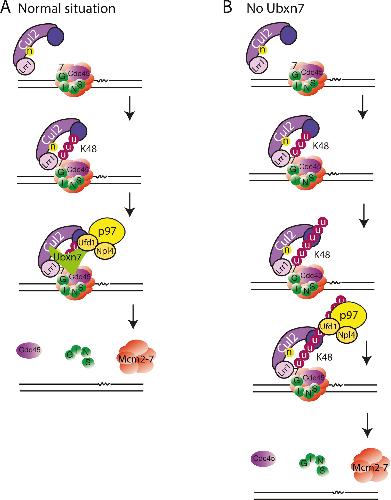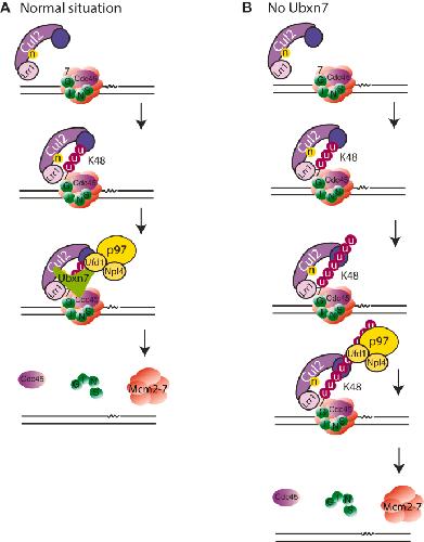 Figure 6. Proposed model of Ubxn7 function. (A) Ubxn7 is bridging Cul2Lrr1, ubiquitylated Mcm7 and the p97 complex, leading to efficient CMG helicase unloading. (B) Delays in replisome unloading upon lack of Ubxn7. p97 can still recognise ubiquitylated Mcm7 but the process is slower and takes longer time. |