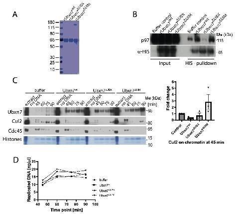 Supplementary Figure 5. (A) Recombinant 6xHIS-Ubxn7, 6xHIS-Ubxn7ÎUBX or 6xHIS-Ubxn7ÎUIM were purified and equal quantity run on a PAGE gel and stained with coomassie. (B) Ubxn7ÎUBX cannot interact with p97. Interphase egg extract was supplemented with recombinant 6xHIS-Ubxn7, 6xHIS-Ubxn7ÎUBX or 6xHIS-Ubxn7ÎUIM and the recombinant proteins were pulled out from replicating egg extract in the middle of S-phase. The ability of recombinant proteins to interact with p97 was analysed by western blotting. (C) Interphase egg extract was supplemented with Ubxn7 or mutants as in (A) and chromatin samples isolated at indicated timepoints during replication reaction. Chromatin samples were analysed by western blotting with indicated antibodies (left). The level of Cul2 bound to chromatin at 45 min of replication reaction was quantified (n=3). Fold change over buffer control is presented. Individual points, mean and SEM. (C) Addition of high concentration of rUbxn7 or its mutants to the egg extract does not inhibit egg extract ability to replicate DNA. LFB1/50 buffer or 6HIS-Ubxn7, 6HIS-Ubxn7ÎUBX or 6HIS-Ubxn7ÎUIM at 0.3 mg/ml final concenetration. Extract ability to incorporate α-32PdATP into nascent DNA was quantified. |
