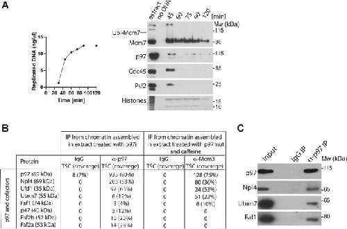 Figure 1. Cofactors interacting with p97 on replicating chromatin in Xenopus laevis egg extract.A, chromatin binding of p97 follows replication fork components. A replication reaction was set up in X. laevis egg extract and synthesis of nascent DNA was followed by incorporation of radioactive α-P32dATP into newly synthesized DNA (left). At the same time, chromatin was isolated during the replication reaction at indicated time points after sperm DNA addition. Sample without DNA addition was processed in parallel to provide a chromatin specificity control. Histones at the bottom of the PAGE gel were stained with colloidal Coomassie for loading and sample purity control. Chromatin samples were analyzed by Western blotting with indicated antibodies (right). B, Ubxn7 and Faf1 are identified as cofactors interacting with both p97 and terminated replisome. Interphase egg extract was supplemented with p97i (NMS873) and chromatin was isolated in late S-phase when high levels of terminated replisomes are accumulated on chromatin. Protein complexes were released from chromatin by Benzonase treatment and proteins interacting with p97 segregase were analyzed by mass spectrometry. Identified putative interactors were screened to find known and potential p97 cofactors. Obtained data were compared with the mass spectrometry results of interactors of terminated replisomes published previously (4). Total spectral count is presented with protein coverage in the brackets. Only p97 and its cofactors are presented. Other proteins identified in p97 IP are included in Table S1. C, verification of p97 interaction with Ubxn7 and Faf1 on chromatin. A small proportion of input and immunoprecipitated sample from p97 IP described in (B) was analyzed by Western blotting with indicated antibodies. |