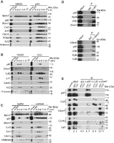 Figure 4. Regulation of Ubxn7 chromatin binding.A, p97 and Ubxn7 accumulate on chromatin upon p97 activity inhibition. Interphase egg extract was supplemented with DMSO or p97i and chromatin was isolated during the replication reaction. Chromatin samples were analyzed as in Figure 1A. Representative experiment is presented here and quantification over n = 3 in Fig. S4A. B, p97 and Ubxn7 decrease on chromatin upon cullin activity inhibition. Interphase egg extract was supplemented with DMSO or CULi and chromatin was isolated during the replication reaction. Chromatin samples were analyzed as in (A). Representative experiment is presented here and quantification of n = 4 in Fig. S4B. C, p97 and Ubxn7 accumulate on chromatin upon inhibition of polyubiquitylation. Interphase egg extract was supplemented with LFB1/50 buffer or 6HIS-UbiNoK and chromatin was isolated during the replication reaction. Chromatin samples were analyzed as in (A). Representative experiment is presented here and quantification of n = 3 in Fig. S4C. D, Ubxn7 interacts with p97 but not with Cul2 in egg extract. Ubxn7 or p97 were immunoprecipitated from egg extract. Interacting partners were analyzed by Western blotting with indicated antibodies. E, interaction between Ubxn7, p97, and Cul2 is disrupted when neddylation of Cul2 is inhibited. Interphase egg extract was supplemented with CULi (MLN4924) or p97i (NMS873). Chromatin was isolated in late S-phase when a high level of post-termination replisomes accumulated on chromatin, protein complexes were released from chromatin by Benzonase treatment and p97, Cul2, or Ubxn7 immunoprecipitated from the chromatin proteome. Immunoprecipitated samples were analyzed by Western blotting with indicated antibodies. Short and long exposures for each of the immunoprecipitated proteins are presented. DMSO, dimethyl sulfoxide. |