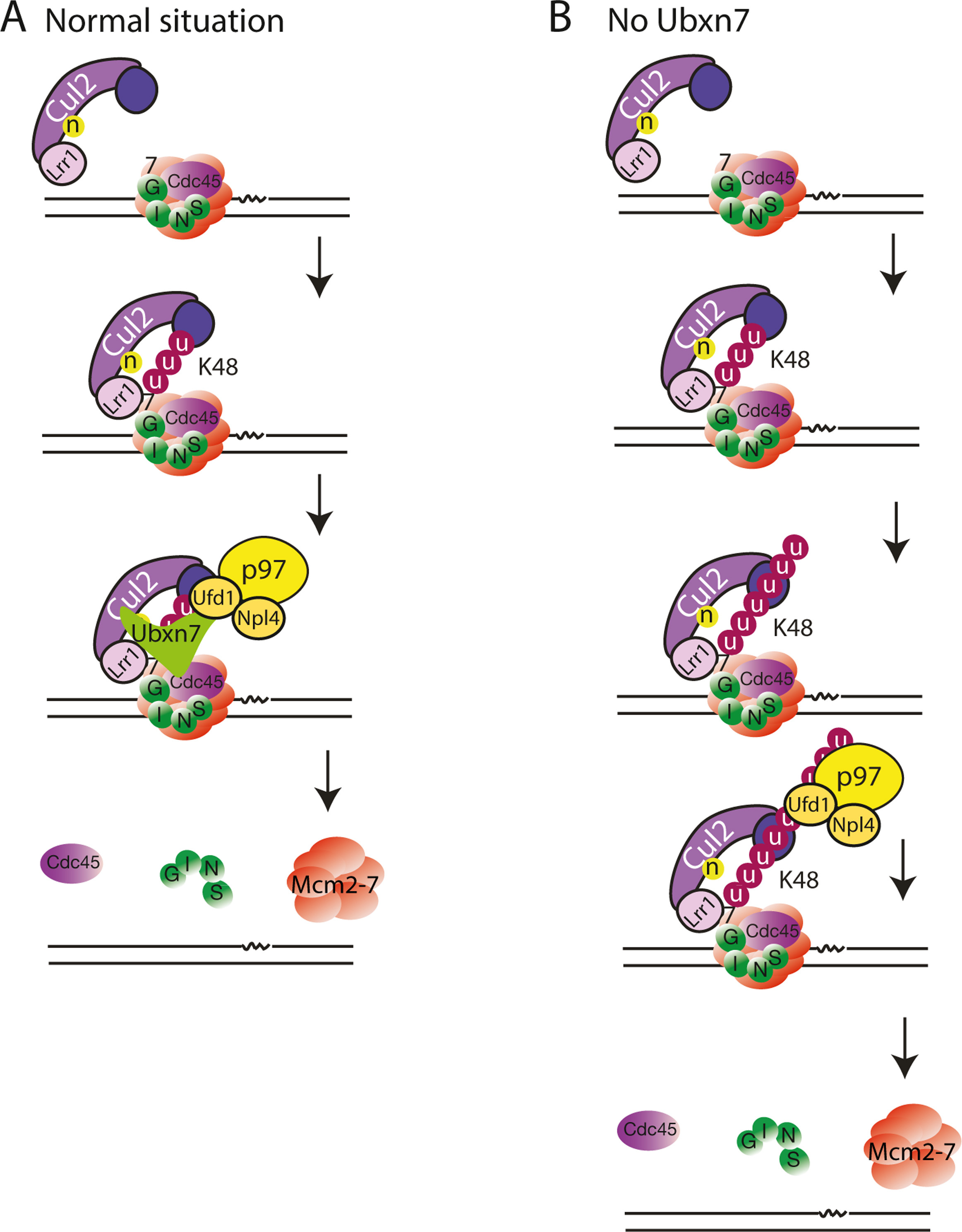Figure 6. Proposed model of Ubxn7 function.A, Ubxn7 is bridging Cul2Lrr1, ubiquitylated Mcm7, and the p97 complex, leading to efficient CMG helicase unloading. B, delays in replisome unloading upon lack of Ubxn7. p97 can still recognize ubiquitylated Mcm7 but the process is slower and takes longer time. CMG, Cdc45, Mcm2-7 hexamer, and GINS; DMSO, dimethyl sulfoxide. |