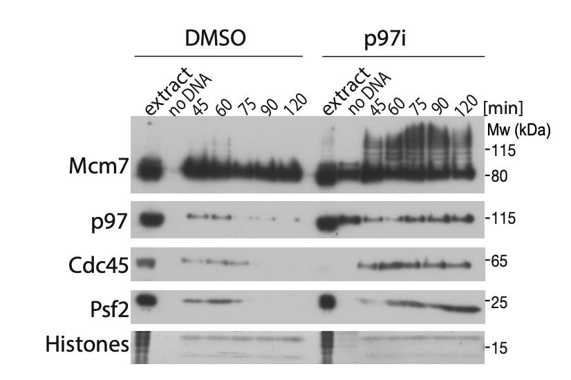 Supplementary Figure 1. p97 accumulates on chromatin upon inhibition of its ATPase activity. Interphase egg extract was supplemented with DMSO or p97i and chromatin samples isolated at indicated timepoints during replication reaction. Chromatin samples were analysed by western blotting with indicated antibodies as in Figure 1A. Presence of a ladder of bands in -DNA control in p97i indicates contamination with cytoplasm in this particular sample. See also Figure 4A for alternative western blot. CMG components (Cdc45 and Psf2) unloading is inhibited with p97i and ubiquitylated forms of Mcm7 accumulate on chromatin when p97 is not active. |