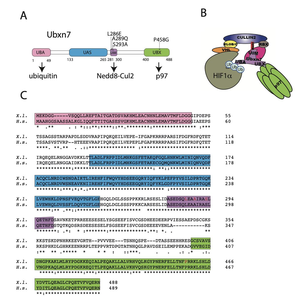 Supplementary Figure 2. (A) Model of Xenopus Ubxn7 structure. The key domains are highlighted together with the mutations incorporated to disrupt UIM and UBX interactions. (B) Model of Ubxn7 function during Hif1α processing. (C) Comparison of Xenopus laevis and human Ubxn7 protein sequence. The domains are highlighted in the same colour as in (A). Amino acids mutated in Ubxn7ΔUBX and Ubxn7ΔUIM mutants are highlighted in red. |