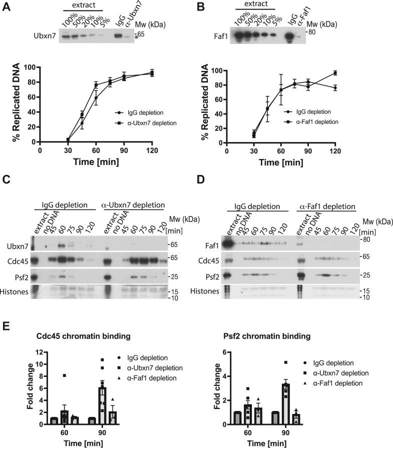 Figure 2. Ubxn7 facilitates terminated replisome unloading.A, Ubxn7 is not required for DNA replication. The remaining level of Ubxn7 upon Ubxn7 immunodepletion was analyzed by Western blotting. The asterisk indicates a nonspecific band (top). The ability of Ubxn7-immunodepleted extract to synthesize nascent DNA was analyzed by incorporation of radioactive α-P32dATP into newly synthesized DNA (n = 6) (bottom). B, Faf1 is not required for DNA replication. The remaining level of Faf1 upon Faf1 immunodepletion was analyzed by Western blotting (top). The ability of Faf1-immunodepleted extract to synthesize nascent DNA was analyzed by incorporation of radioactive α-P32dATP into newly synthesized DNA (n = 3) (bottom). C, Ubxn7 depletion delays terminated replisomes disassembly. Chromatin was isolated during the replication reaction time course in IgG-depleted and Ubxn7-depleted extract. Chromatin samples were analyzed as in Figure 1A with indicated antibodies. Representative experiment out of n = 7. Another repeat of this experiment is presented in Fig. S3C. D, Faf1 depletion does not impact terminated replisomes disassembly. Chromatin was isolated during the replication reaction time course in IgG-depleted and Faf1-depleted extract. Chromatin samples were analyzed as in Figure 1A with indicated antibodies. Representative experiment out of n = 3. E, the fold increase of Cdc45 and Psf2 signal on chromatin in Ubxn7- or Faf1-depleted extracts at indicated time points was quantified in comparison to IgG depletion. For Ubxn7-depleted extract n = 7 for Faf1-depleted extract n = 3. The mean value is presented with all individual points and with SEM as error bars. |