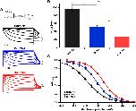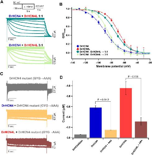 FIGURE 3. DrHCN4 and DrHCN4L can form a heterotetrametric channel. (A) Representative current traces of a mixture of DrHCN4 and DrHCN4L mRNA. The mixed mRNA concentrations were 1:1 (green) and 3:1 (light green). Membrane potential was varied from −30 mV to −130 mV in 10-mV decrements and held for 5 s at each potential. The inset shows the stimulation protocol. (B) Activation curves of the mixed channels of DrHCN4 and DrHCN4L. The mixed mRNA concentrations were 1:1 (green) and 3:1 (light green). Blue and red curves are the activation curves of DrHCN4 and DrHCN4L, respectively. The Boltzmann function fits the activation curves (n = 5). All data are from the same batch of oocytes. Therefore, the data sets of DrHCN4 and DrHCN4L are different from the datasets used in Figures 1, 2. (C) Representative current traces of a dominant-negative mutant with or without wild-type DrHCN4 or DrHCN4L. From top to bottom: DrHCN4 mutant (DrHCN4AAA) only, DrHCN4 (wild-type) + DrHCN4AAA, DrHCN4L (wild-type) + DrHCN4AAA. Wild-type and mutant cRNAs were mixed in a 1:1 ratio with 5 ng each. (D) Averaged current amplitudes at −100 mV were plotted as bar graphs [n = 5 for each except DrHCN4AAA alone (n = 4)]. |