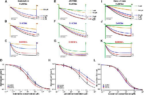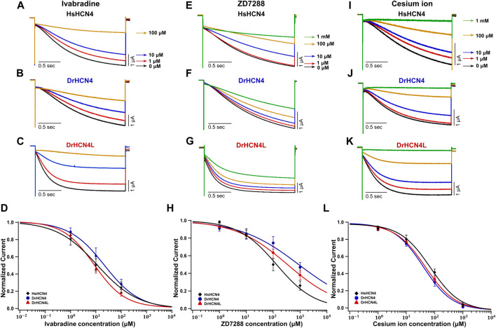 FIGURE 4. Sensitivities of DrHCN4 and DrHCN4L to HCN inhibitors. (A–C) Representative current traces sequentially applied with 0–100 µM of ivabradine. The holding potential was −30 mV and was hyperpolarized to −120 mV for 2 s. (D) Ivabradine inhibition curves based on currents of (A–C). DrHCN4 (blue; n = 5), DrHCN4L (red; n = 4) and HsHCN4 (black; n = 4). (E–G) Representative current traces sequentially applied with 0 μM–1 mM of ZD7288. The holding potential was −30 mV and was hyperpolarized to −120 mV for 2 s. (H) ZD7288 inhibition curves based on currents of (E–G). DrHCN4 (blue; n = 5), DrHCN4L (red; n = 5) and HsHCN4 (black; n = 5). (I–K) Representative currents sequentially applied with 0 μM–1 mM of cesium ion. The holding potential was −30 mV and was hyperpolarized to −120 mV for 2 s. (L) Cesium ion inhibition curves based on currents of (I–K). DrHCN4 (blue; n = 5), DrHCN4L (red; n = 5) and HsHCN4 (black; n = 5). |