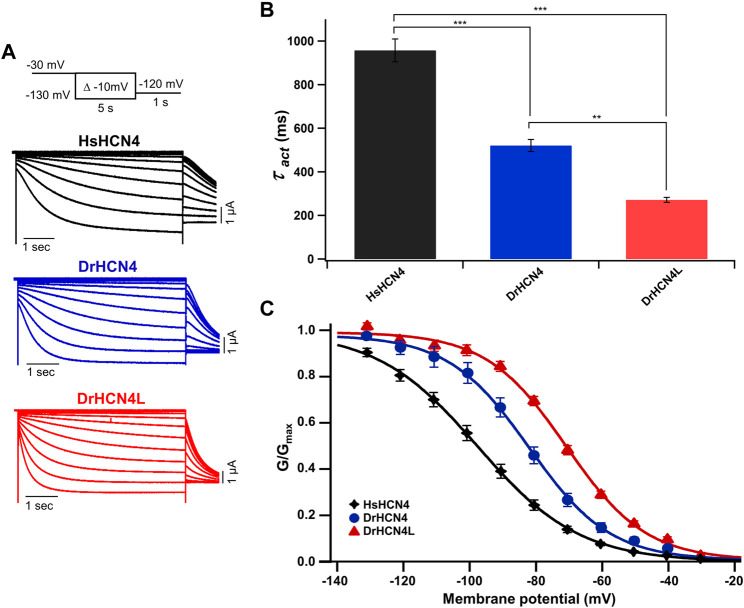 FIGURE 1. Zebrafish HCN4 channels are hyperpolarization-activated ion channels. (A) Representative currents of the human HCN4 channel HsHCN4 (black) and zebrafish HCN4 channels DrHCN4 (blue) and DrHCN4L (red). The holding potential was stepped from −30 mV to −130 mV in 10-mV decrements and held for 5 s at each potential. The inset shows the stimulation protocol. (B) Time constants obtained by fitting the activating currents of HsHCN4 (black), DrHCN4 (red) and DrHCN4L (blue) at −130 mV. (C) Activation curves (G–V curves) of human and zebrafish HCN4 channels (n = 5 for each). |