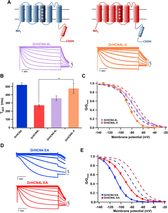 FIGURE 2. The cytoplasmic C-terminal region of DrHCN4 and DrHCN4L determines the voltage dependence. (A) Molecular designs and representative currents of chimeric channels: DrHCN4-4L (left, purple) and DrHCN4L (right, orange). (B) Activation time constants (τ