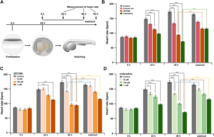 FIGURE 5. HCN inhibitors reduce heart rate in developing zebrafish embryos. (A) Experimental method. Inhibitors were administered in the egg water at 24 hpf, and this time point was designated as “0 h”. After administering the inhibitors, heart rate was measured at 24 h (24 h) and 48 h (48 h). Zebrafish were then transferred back to the inhibitor-free egg water, and their heart rates were measured 6 h later (washout). (B) Changes in heart rate with time in zebrafish before (control; grey; n = 10) and after treatment with 1 mM cesium ion (pink; n = 10), ZD7288 (orange; n = 10) and ivabradine (green; n = 10) inhibitors. Heart rates before (0 h) and at 24 h (24 h) and 48 h (48 h), after application of the inhibitors and at 6 h after washing out the inhibitors (washout) are shown as bar graphs. Dunnett’s test was used for statistical analysis, and Student’s t-test was used to compare before and after “washout.” (C) Changes in heart rate with time in zebrafish treated with ZD7288 before (gray; n = 10) and after treatment with 10 μM (light orange; n = 10), 100 μM (orange; n = 10), and 1 mM (dark orange; n = 10). Dunnett’s test was used for statistical analysis, and Student’s t-test was used to compare before and after washout. (D) Changes in heart rate with time in zebrafish treated with ivabradine before (gray; n = 10) and after treatment with 10 μM (thin green; n = 10), 100 μM (light green; n = 10) and 1 mM (dark green; n = 10). Dunnett’s test was used for statistical analysis, and Student’s t-test was used to compare before and after washout. |