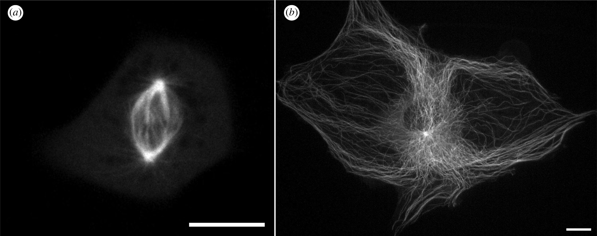 Figure 6. Cells stably expressing EGFP-tubulin imaged with spinning disc confocal microscopy. (a) XTN-6 cell in mitosis. Image depicts cell at metaphase captured from a time lapse video recording which is shown in electronic supplementary material, video S1. (b) A large XTN-8 cell in interphase. Image depicts a flattened z projection of a live cell. Bars = 10 µm.