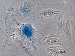 Figure 4. Expression of the senesce marker beta-galactosidase indicated by the blue colour in this phase-contrast image of XTN-12 cells initially plated at low density. Bar = 20 µm.