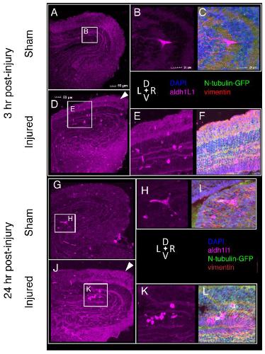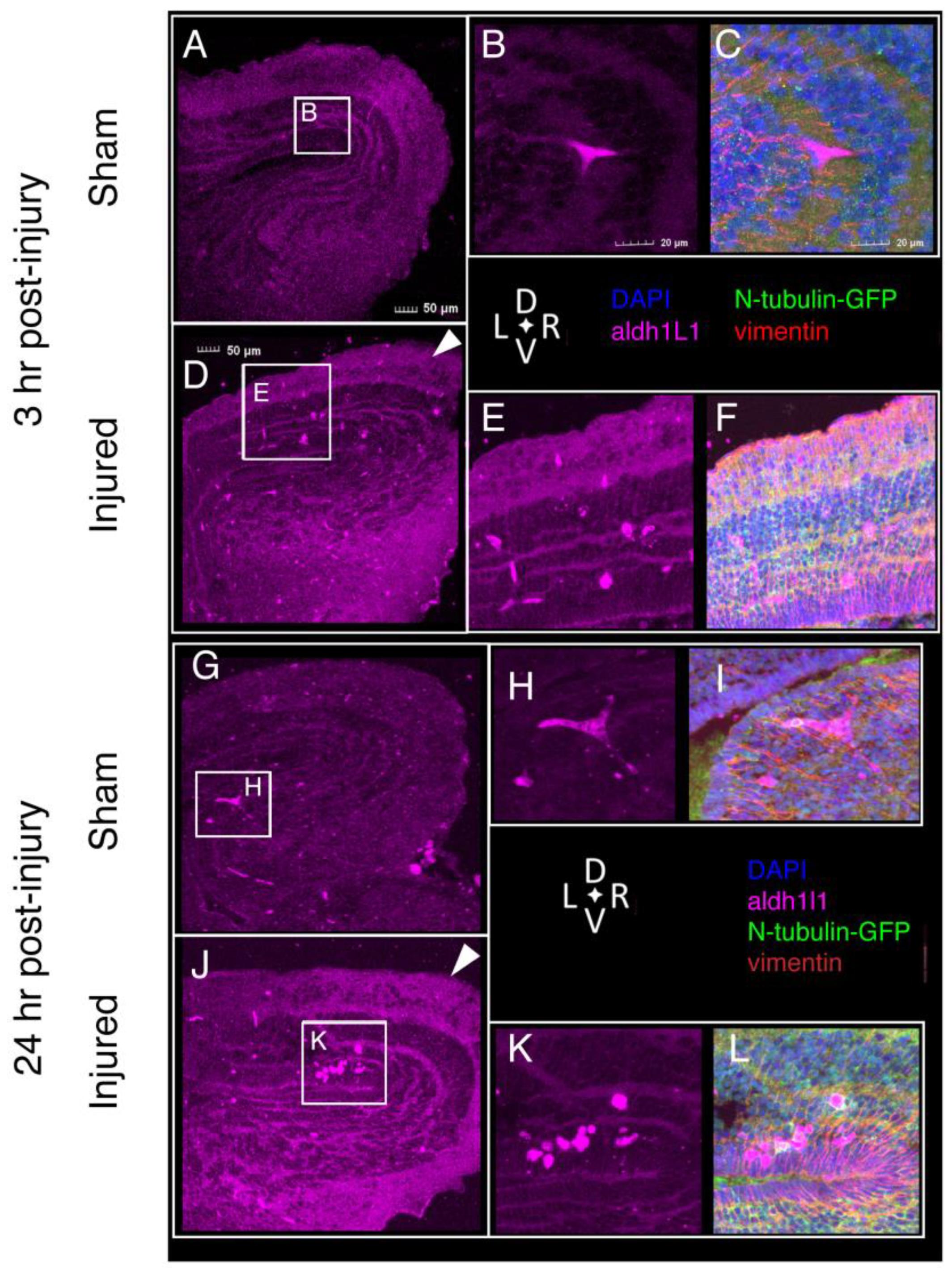 Figure 3. Astrocytes visualized with antibodies against Aldh1L1 via immunofluorescence microscopy. Sections from NF stage 55 N-tubulin-GFP+ Xenopus laevis midbrains of both sham (AâC) and injured (DâF) animals at 3 h post-injury show astrocytes (aldh1L1-positive) in the dorsolateral midbrain and optic tectum (OT). Astrocytes in midbrains 3 h after injury show differences in morphology (B vs. E) and distribution (A vs. D); these differences persist at 24 h post-injury. (GâI), sham; (JâL), injured. (For all images, Alexa Fluor 647 signal was digitally converted to magenta. Sections were also processed to visualize neurons (anti-GFP, green), nuclei (DAPI, blue), and intermediate filaments (anti-Vimentin, red). Sections are 14 µm thick and images selected are representative of all samples examined (n = 6 brains). |
