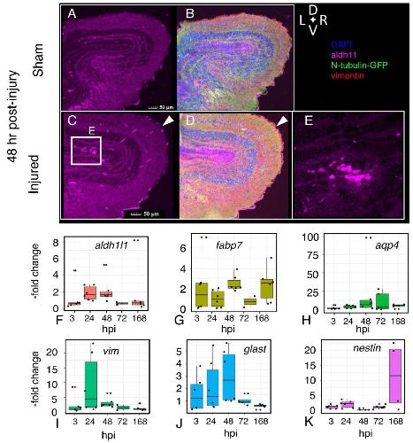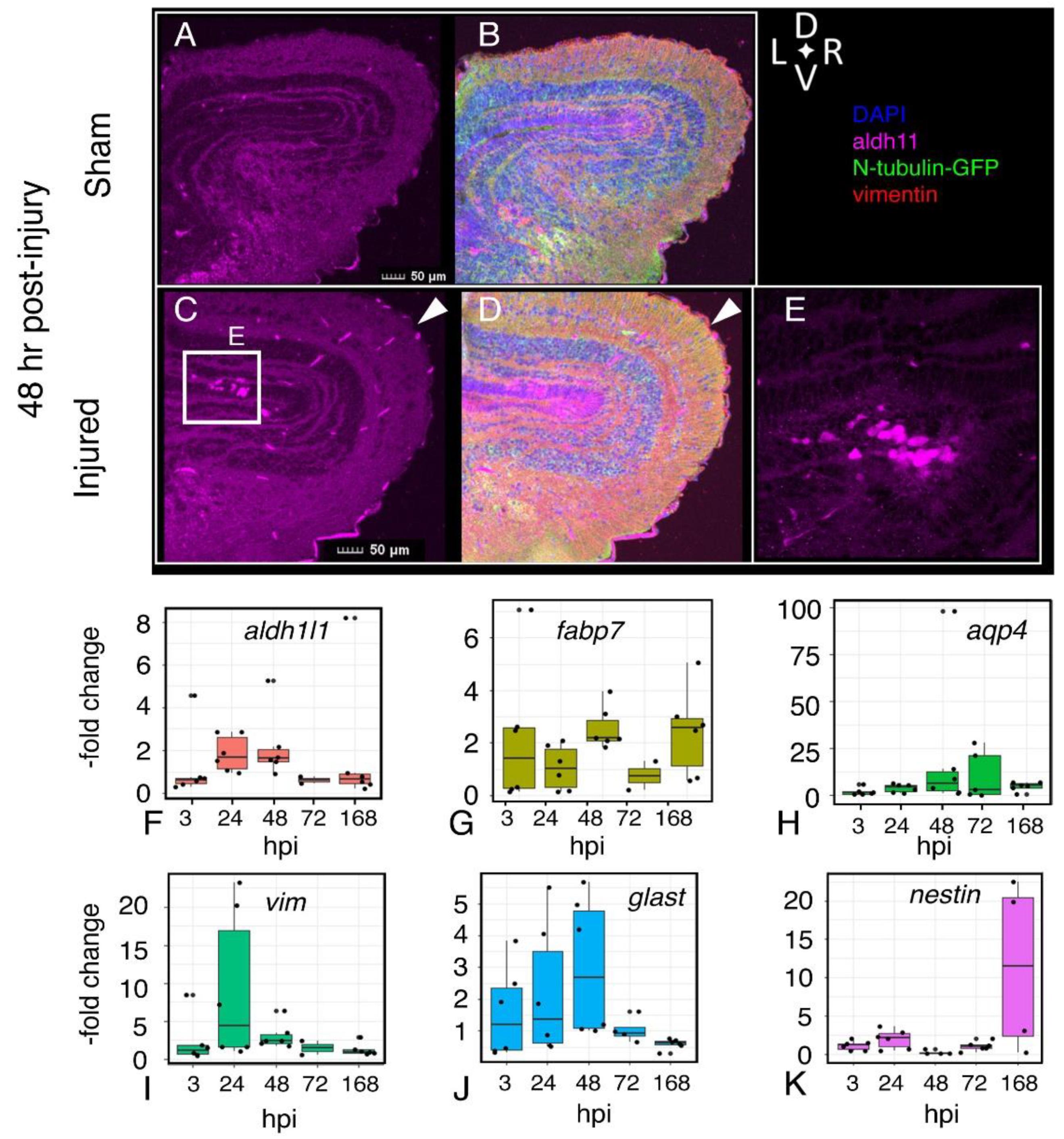 Figure 6. Persistence of altered astrocyte morphology and expression of astroglial genes following injury. Visualization of astrocytes (aldh1l1-positive cells, magenta), neurons (N-tubulin-GFP), radial glia (vimentin-positive, red) in sham (A,B) and injured (CâE) 48 h after injury. Amoeboid astrocytes accumulate near the ventricular layer (C,E). Quantitative RT-PCR assays for expression of astroglia-associated genes Aldehyde dehydrogenase 1 family member 1 (aldh1l1) (F), fatty acid-binding protein 7 (fabp7) (G), aquaporin4 (aqp4) (H), vimentin (vim) (I), excitatory amino acid transporter 1 (glast) (J), and nestin (nes) (K). RNA was isolated from sham and injured midbrains at the intervals shown; injured values are normalized to sham-treated controls. Plots show individual data points and a box showing the mean and 95% confidence intervals. n ⥠6 experiments. |