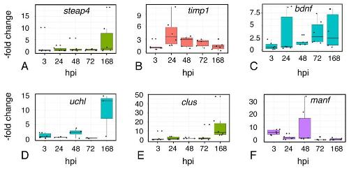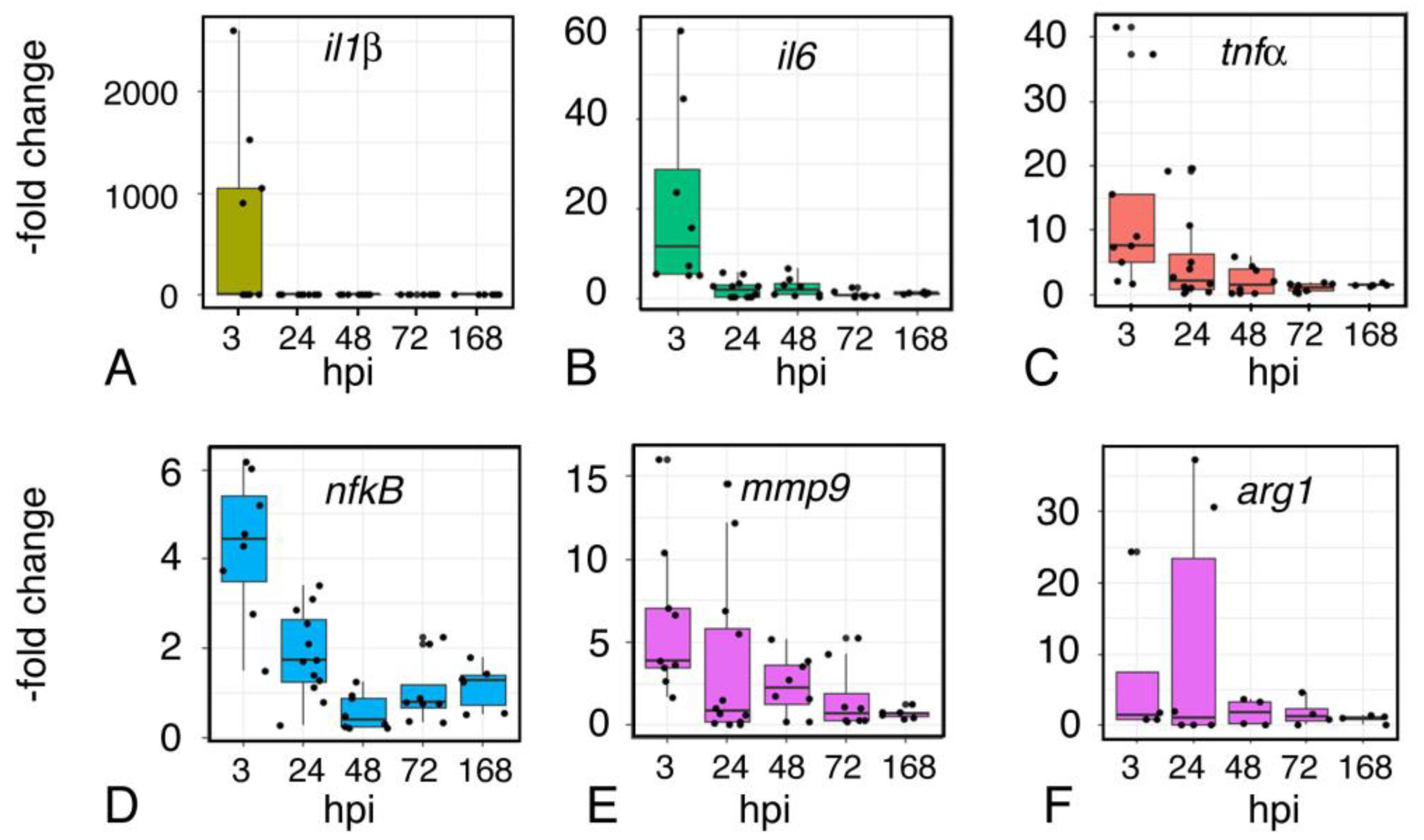 Figure 9. Time course of expression of inflammation-associated genes following injury. Quantitative RT-PCR assays for expression of the inflammatory cytokines Interleukin1-β (il1β) (A), Interleukin6 (il6) (B), Tumor Necrosis Factor-α (tnf-α) (C), as well as Nuclear Factor kB (nfkB) (D), matrix metalloproteinase 9 (mmp9) (E), and arginase (arg) (F). RNA was isolated from sham and injured midbrains at the intervals shown; injured values are normalized to sham-treated controls. Plots show individual data points and a box showing the mean and 95% confidence intervals. N ≥ 4 experiments. |
