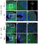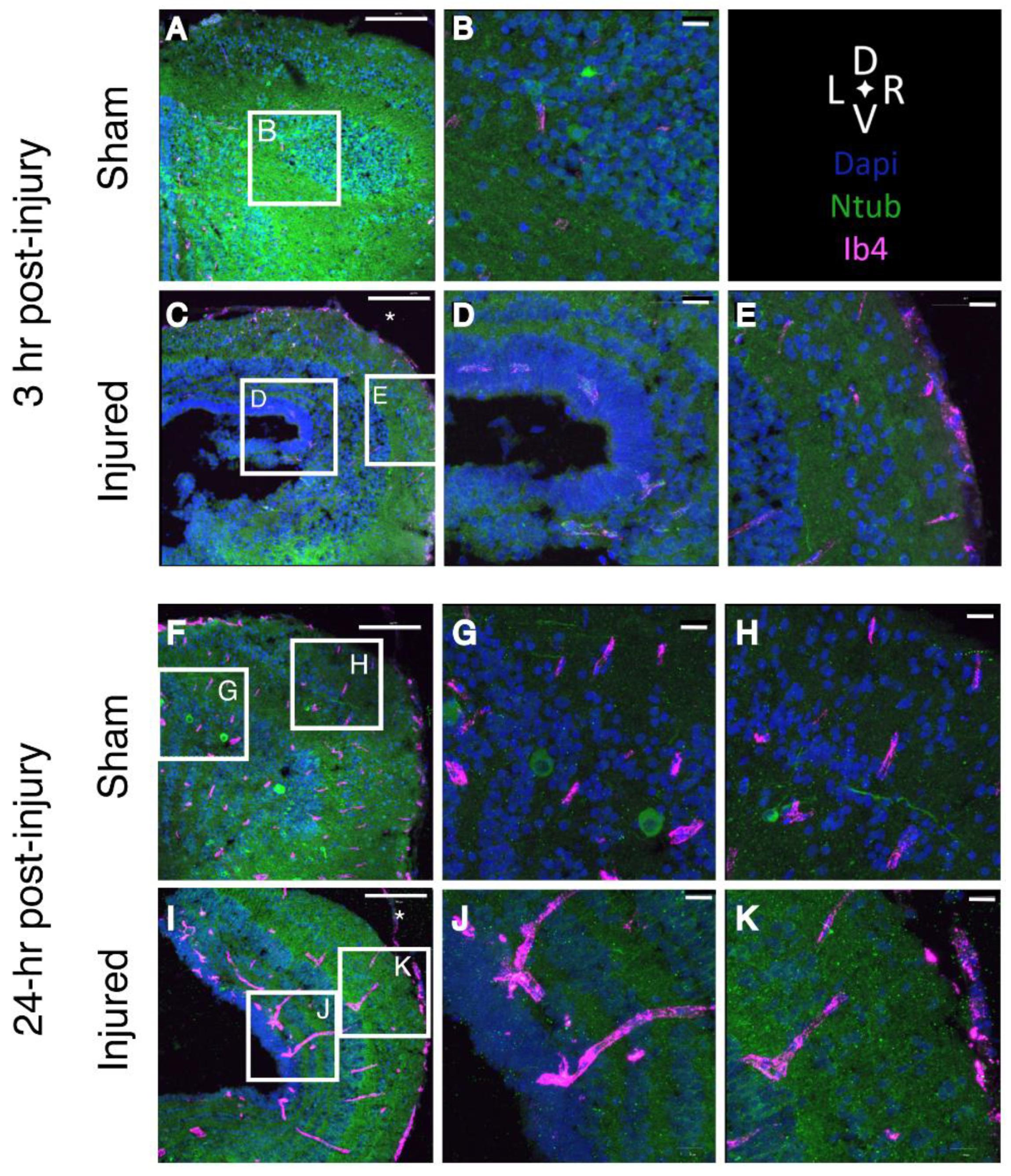 Figure 4. Microglia localize around the ventricle of the injured midbrain. Confocal images of midbrains 3 h after injury; midbrains were isolated from N-tubulin-GFP tadpoles (neurons, green) injected with Ib4-Alexa 647 to label microglia (magenta). Brain were sectioned at 15 µm; nuclei are labeled with DAPI (blue). (A,B) Sham-treated midbrain. (CâE) Midbrain 3 h after injury. (E) Microglia accumulate near the site of injury. (A,C): Scale bar 100 µm. (B,D,E): Scale bar 20 µm. Scale 100 µm. (FâK), confocal images of St. 55 midbrains after 24 h. In the sham brain, microglia are visible both close to the ventricle (G) and toward the periphery of the neuropil (H). In the injured midbrain, microglia form clusters both near the ventricles (J) and in the neuropil near the site of injury (K). (F,I): Scale bar 100 µm. (G,H,J,K): Scale bar 20 µm. Asterisks in (C,I) mark the site of injury (n = 3). * indicates the site of administration for the focal impact injury. |