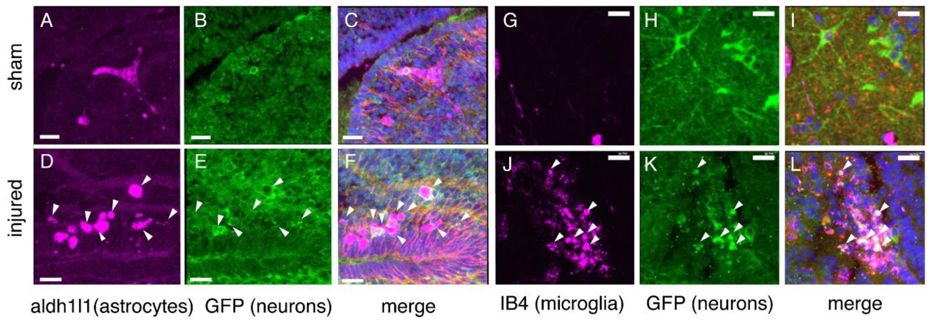 Figure 5. Evidence of phagocytic astrocytes and microglia following injury. Injured midbrains 24 h post-injury include both astrocytes (DâF) and microglia (JâL) that are positive for N-tubulin-GFP (white arrowheads), as well as for aldh1l1 (astrocytes) or IB4 (microglia); merged fluorescent signal appears white. Magenta (AâF), aldh1l1; Magenta 9 (GâL), IB4; Green, N-Tubulin-GFP; Blue, DAPI. Sham brains (AâC,GâI) contain no more than a few such cells. scale bars, 20 µm. |