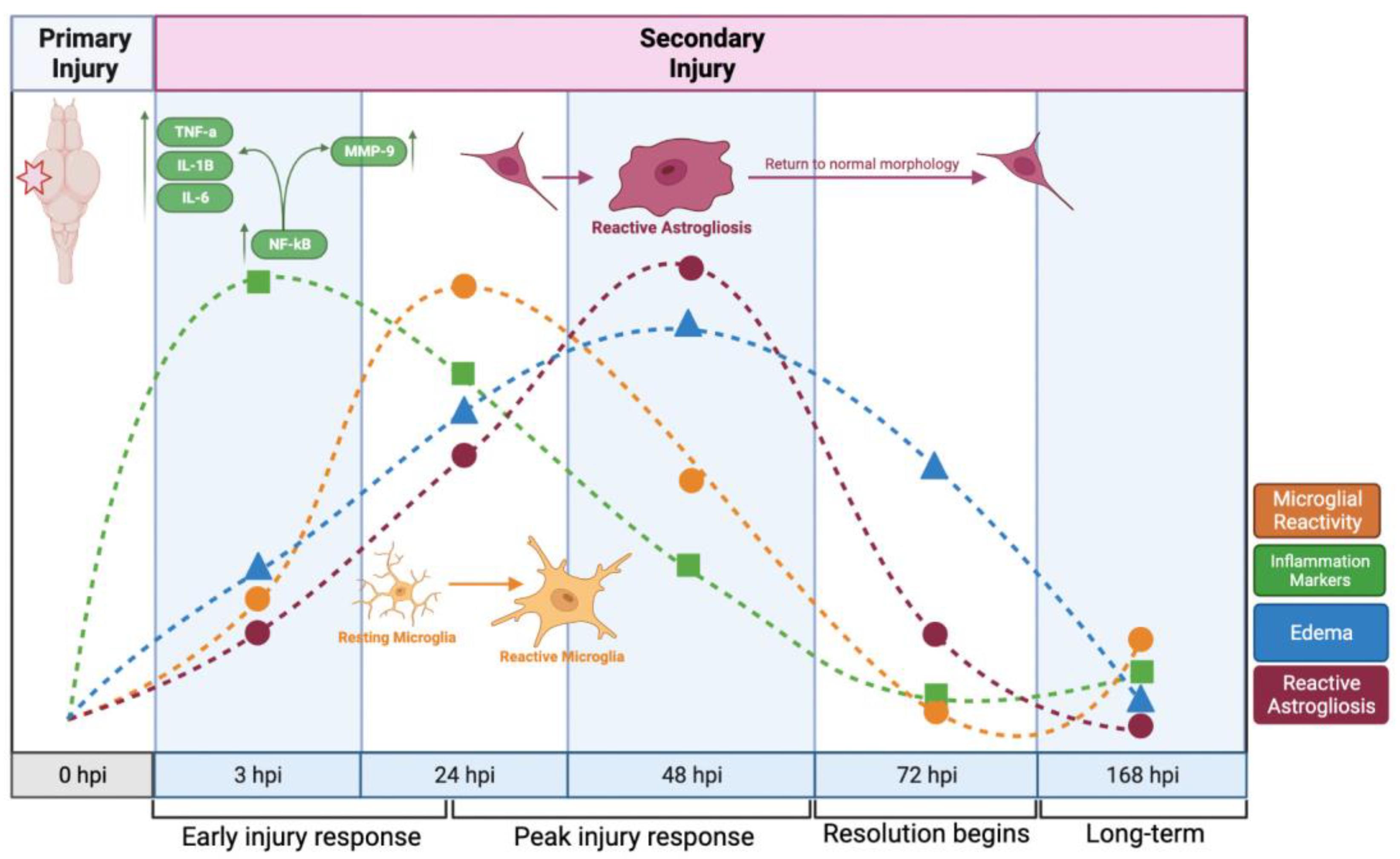 Figure 10. A timeline of response to focal impact injury. The response to focal impact injury begins with the release of inflammatory cytokines, followed by microglial activity, astrocyte reactivity, and edema. Within 48 h, each of these activities has peaked, and all have subsided to near-baseline levels after one week (This image was made using BioRender (Suite 200, Toronto, ON, M5V 2J1)). |