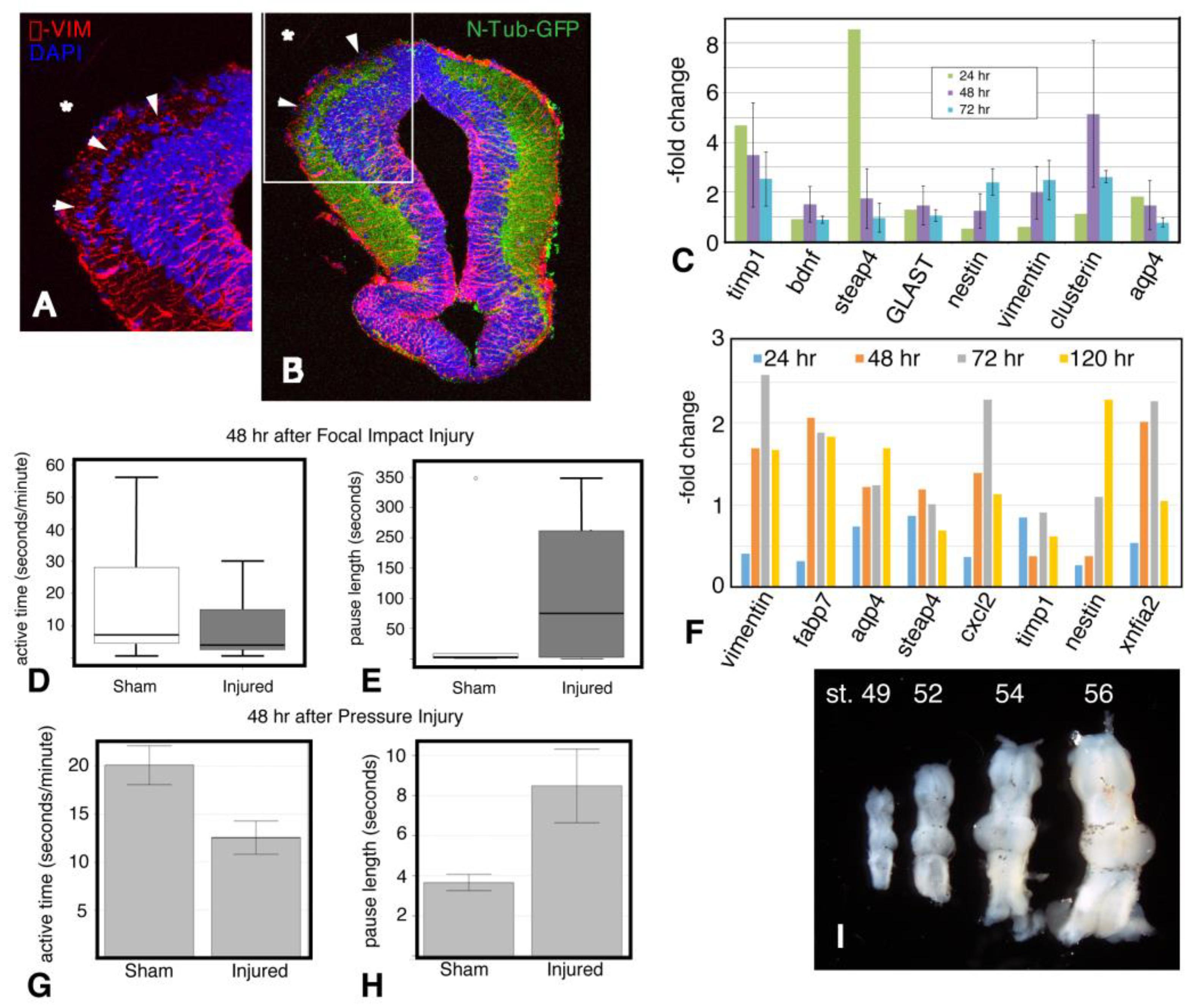 Figure A1. Initial comparisons of focal impact and pressure injury. Midbrain of a st. 48 N-tubulin-GFP tadpole 72 h after focal impact injury. Asterisks mark injured side. (A) Enlarged image of injury site; arrowheads indicate cells that have migrated into the injury area. (B) Entire section shows differences between injured and uninjured sides. Arrowheads show loss of axonal material at the injury site. Red, anti-vimentin (astrocytes and radial glia); Blue, DAPI (nuclei); Green, N-Tubulin-GFP (axons). (C) Quantitative RT-PCR of gene expression in brains from tadpoles subjected to focal impact injury shows expression profile of selected genes at 24, 48, and 72 h post-injury. Genes include markers of reactive astrocytes (timp1, steap4), astrocytes (GLAST, aqp4), radial glia (nestin), and neuroprotective genes (bdnf, clusterin). Open field assays show behavioral alterations in response to focal impact injury (D,E). (D) Comparison of active time in sham vs. injured tadpoles measured during a 10-min interval. Tadpoles were not prescreened for baseline activity. N ⥠10 tadpoles/ sample. (E) Comparison of pause duration in sham vs. injured tadpoles from the same recordings. N ⥠10 tadpoles/sample. (F) Quantitative RT-PCR of gene expression in brains subjected to pressure injury at 24, 48, 72, and 120 h post-injury. Genes include markers of astrocytes (vimentin, fabp7, aqp4, xfia2), reactive astrocytes (timp1, steap4), inflammation (cxcl2), and radial glia (nestin). Open Field assays of tadpoles subjected to pressure injury (G,H). (G) Comparison of active time in sham vs. pressure-injured tadpoles measured during a 10-min interval. Again, tadpoles were not prescreened for baseline activity. N = 50 tadpoles/sample. (H) Comparison of pause duration in sham vs. pressure-injured tadpoles from the same recordings. N = 50 tadpoles/sample. (I) Dramatic growth in brain size during the first half of metamorphosis (st. 48â56). |