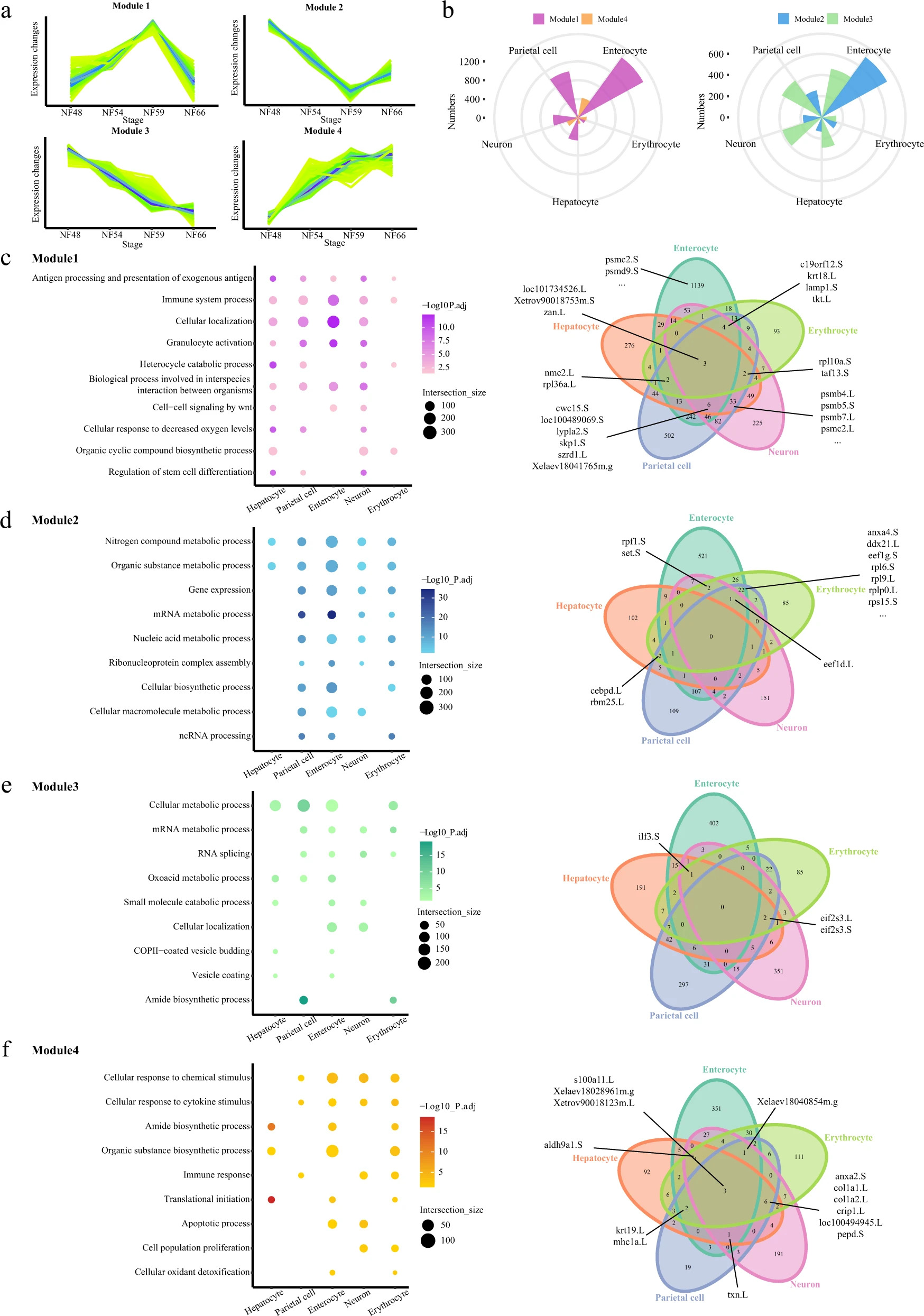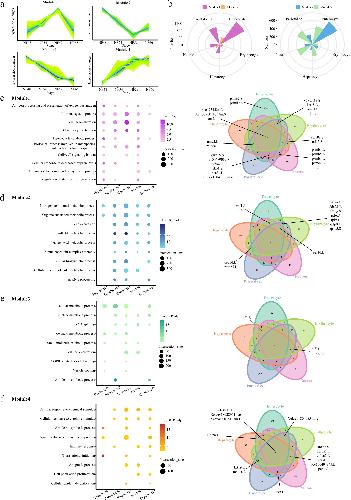 Fig. 6: Gene expression profiles of the remodeling multisystem during metamorphosis. a Schematic diagram of the four modules. b Rose diagrams showing the distribution of DEGs in each cell type. Different modules are labeled in different colors. c–f Representative GO terms enriched in module 1 (c), 2 (d), 3 (e), and 4 (f) for five cell types, respectively (left). GO terms enriched in different modules are labeled in different colors. Venn diagrams showing the numbers of shared genes in each module (right). The bold lines indicate the representative genes shared in at least three cell types. P value was calculated by the hypergeometric distribution, statistical test is one-sided, adjustments P values were made after P value is corrected by Benjamin–Hochberg multiple tests. |