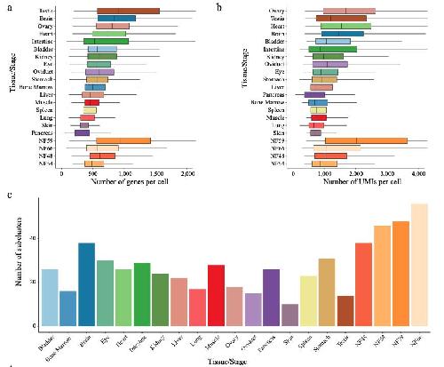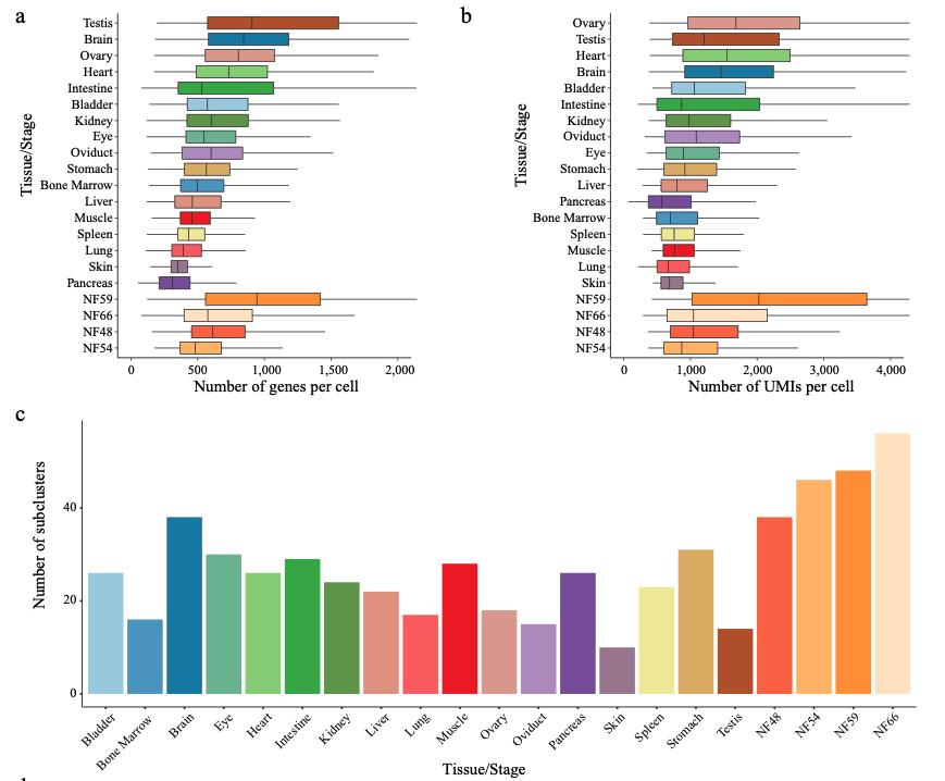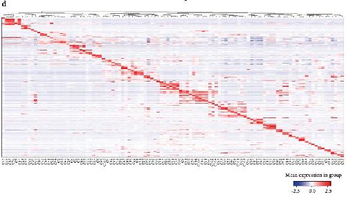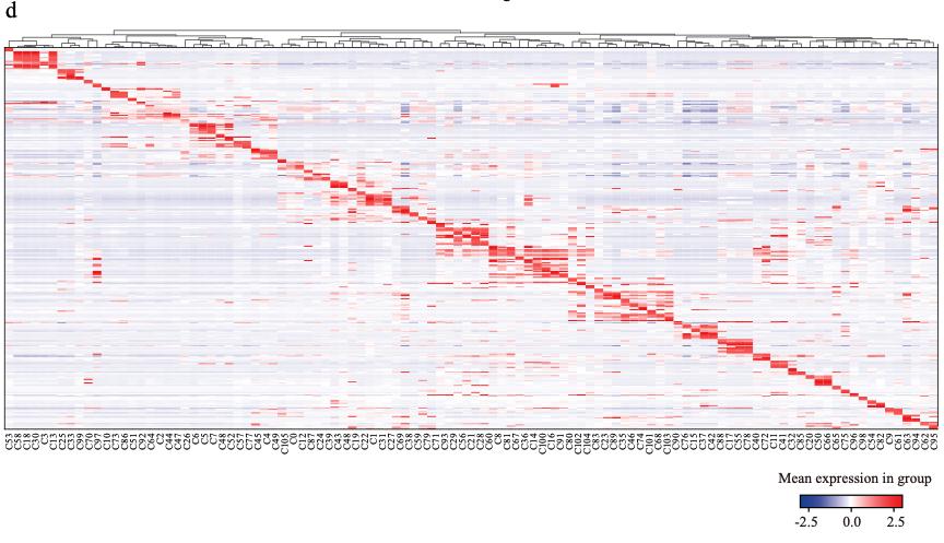 Supplementary Figure 1. [panel d] Details of XCL construction. a, Number of genes per cell detected for each tissue/stage in the XCL. b, Number of UMIs per cell detected for each tissue/stage in the XCL. c, Number of subclusters detected for each tissue/stage in the XCL. d, Heatmap showing representative gene expression in each cell cluster in the XCL. |