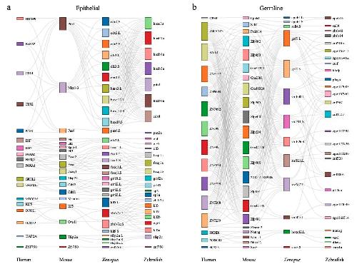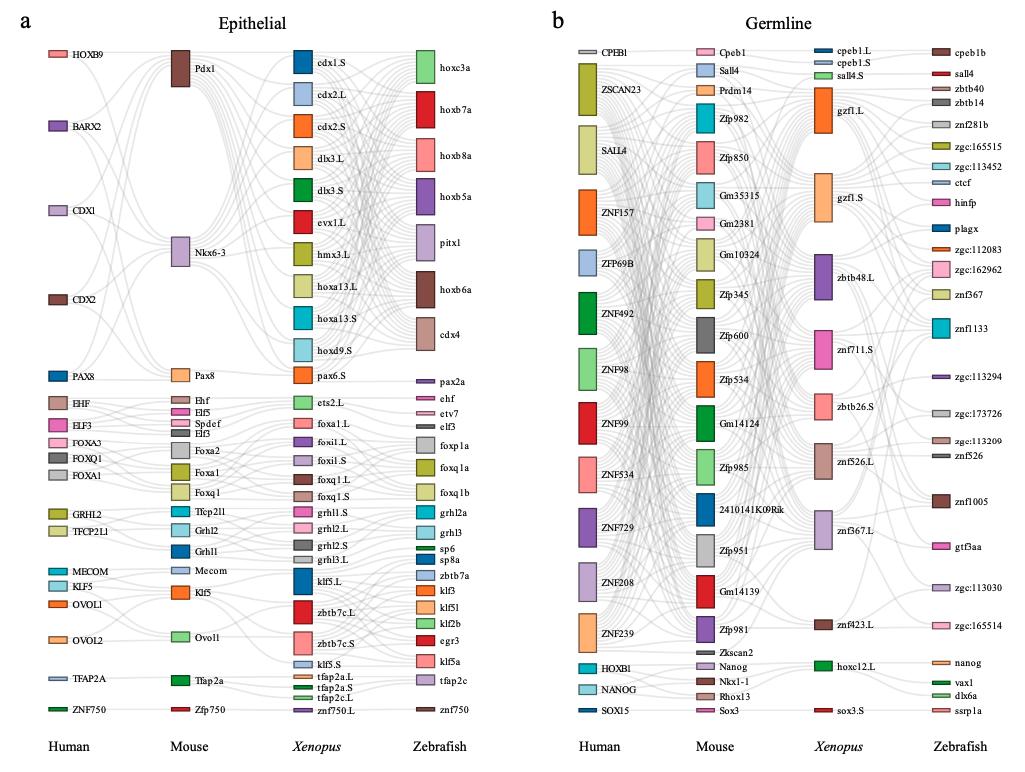 Supplementary Figure S7. [panel a Epithelial and b germline] The common lineage-specific TFs for each lineage. Sankey plot showing common lineage-specific TFs in epithelial (a), germline (b), erythrocyte (c) and immune (d). Different TFs in each species are marked in different color boxes. Homologous TFs between species obtained from SAMap are connected by lines. |