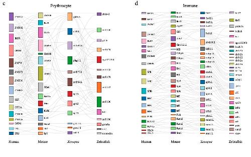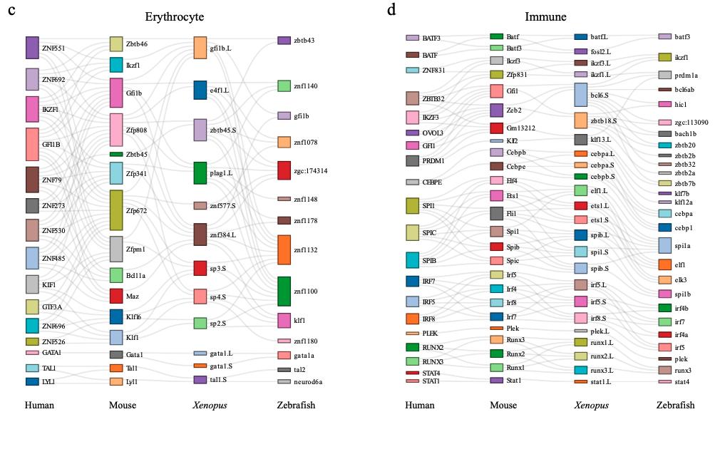 Supplementary Figure S7. [panel b Erythrocyte and d Immune] The common lineage-specific TFs for each lineage. Sankey plot showing common lineage-specific TFs in epithelial (a), germline (b), erythrocyte (c) and immune (d). Different TFs in each species are marked in different color boxes. Homologous TFs between species obtained from SAMap are connected by lines. |