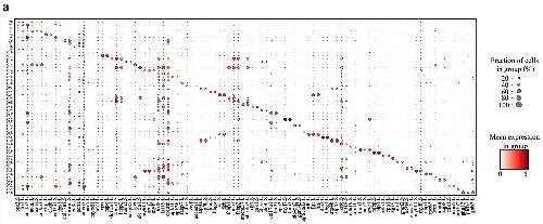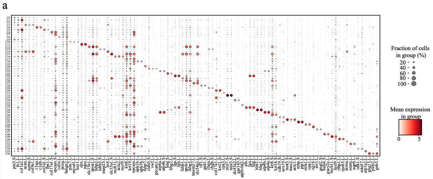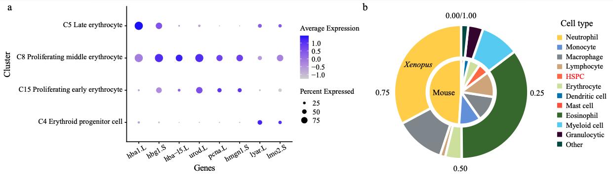 Supplementary Figure 4. Details of cellular heterogeneity in adult Xenopus liver and bone marrow. a, Representative gene expression in each cluster of liver erythrocytes in different stages. The size of the dot encodes the percentage of cells within a cell type, and the color encodes the average expression level. b, Cell proportions of bone marrow in Xenopus (outer circle) and mouse (inside circle). Cell types are labeled in different colors. |