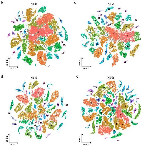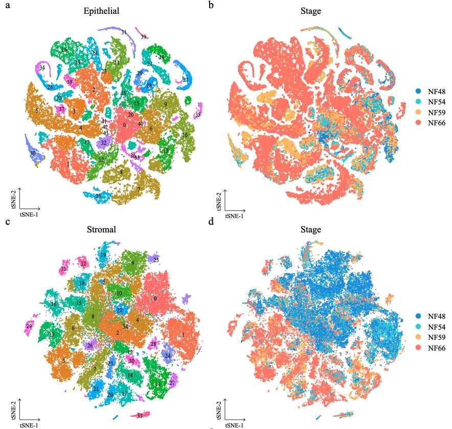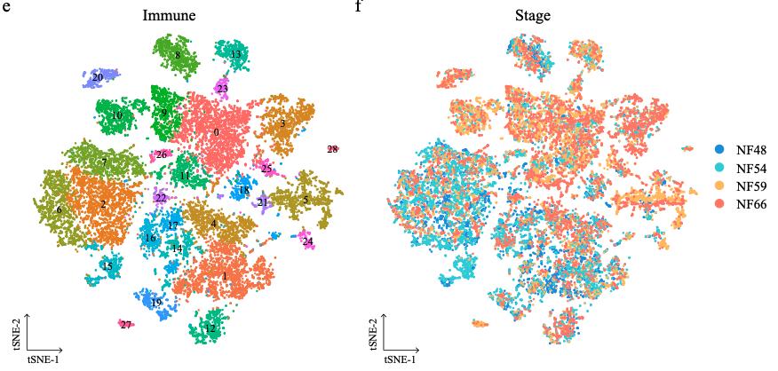Supplementary Figure 10. [panel c] Cellular heterogeneity of larval Xenopus cell lineages. t-SNE maps of single-cell data from larval epithelial (a), stromal (c) and immune (e) during metamorphosis. Cells are colored by cell-type cluster; t-SNE maps of single-cell data from larval epithelial (b), stromal (d) and immune (f) during metamorphosis. Cells are colored by stage. |