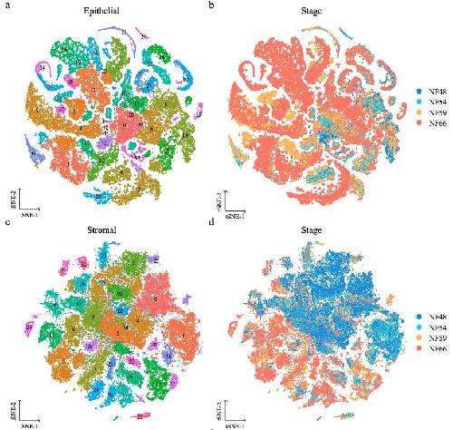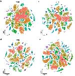 Supplementary Figure 10. [ panels a b] Cellular heterogeneity of larval Xenopus cell lineages. t-SNE maps of single-cell data from larval epithelial (a), stromal (c) and immune (e) during metamorphosis. Cells are colored by cell-type cluster; t-SNE maps of single-cell data from larval epithelial (b), stromal (d) and immune (f) during metamorphosis. Cells are colored by stage. |