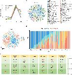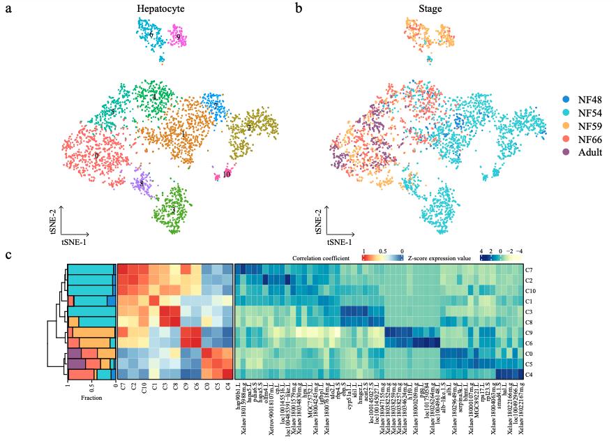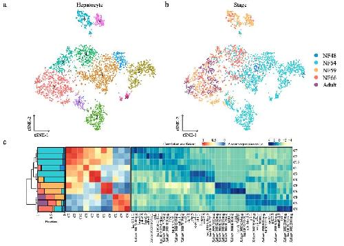Supplementary Figure 12. [panels a b c ] The correlation between larval and adult cell types. t-SNE maps of single-cell data from larval and adult hepatocytes (a) and neurons (d). Cells are colored by cell-type cluster; t-SNE maps of single-cell data from larval and adult hepatocytes (b) and neurons (e). Cells are colored by stage. Heatmap showing representative gene expression and correlation of larval and adult hepatocytes (c) and neurons (f). AUROC scores were used to measure the similarity of cell types: red, high correlation; blue and yellow, low correlation, based on the Spearman correlation. The stacked bar plots illustrate the proportion of clusters. Stage is marked by different colors same as b and d, respectively. |