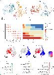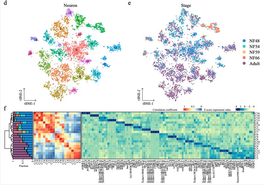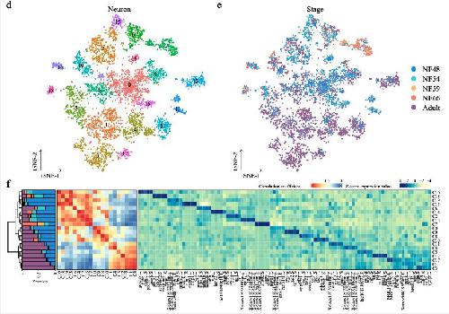 Supplementary Figure 12. [panels d e f ] The correlation between larval and adult cell types. t-SNE maps of single-cell data from larval and adult hepatocytes (a) and neurons (d). Cells are colored by cell-type cluster; t-SNE maps of single-cell data from larval and adult hepatocytes (b) and neurons (e). Cells are colored by stage. Heatmap showing representative gene expression and correlation of larval and adult hepatocytes (c) and neurons (f). AUROC scores were used to measure the similarity of cell types: red, high correlation; blue and yellow, low correlation, based on the Spearman correlation. The stacked bar plots illustrate the proportion of clusters. Stage is marked by different colors same as b and d, respectively. |