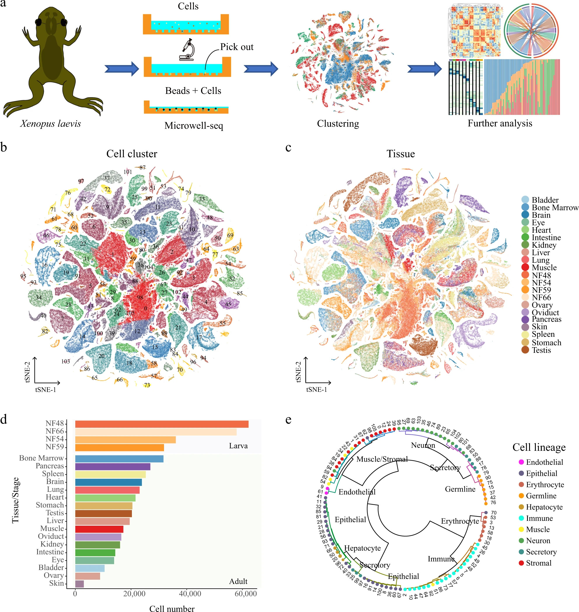 Fig. 1: Constructing an XCL using Microwell-seq. a A schematic of the basic workflow for the Xenopus cell landscape using the Microwell-seq platform. b t-SNE analysis of 501, 358 single cells collected from larval and adult tissues. The 106 cell-type clusters are labeled in different colors. Cell cluster markers are listed in Supplementary Dataset 1. c t-SNE analysis of 501, 358 single cells collected from larval and adult tissues. Tissues/stages are labeled in different colors. d Cell number of each tissue/stage is detected at the XCL. Tissues/stages are labeled in different colors. e The 106 cell-type clusters are re-clustered into ten cell lineages and circles showing the relationships among the 106 cell types. Cell lineages are labeled in different colors. |