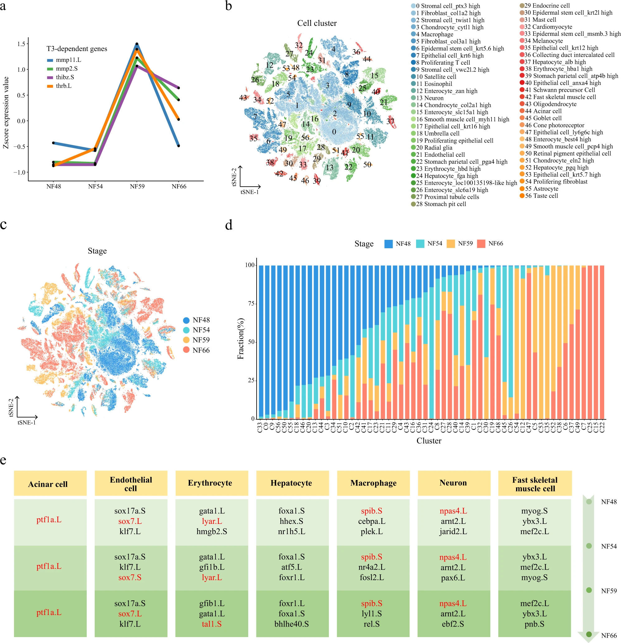 Fig. 4: Cell landscape of larval Xenopus during metamorphosis. a Expression trajectory of genes regulated by T3 during metamorphosis. b, t-SNE analysis of 188, 020 single cells collected from larval Xenopus. 57 cell-type clusters are labeled in different colors. Cell cluster markers are listed in Supplementary Dataset 1. c t-SNE analysis of 188, 020 single cells collected from larval Xenopus. Stages are labeled in different colors. d Stage proportion in different cell clusters. Stages are labeled in different colors. e dTFs are listed in different stages for cell lineages. Each row represents one stage and each column represents one cell type. The representative TFs for each cell types are labeled by red. |