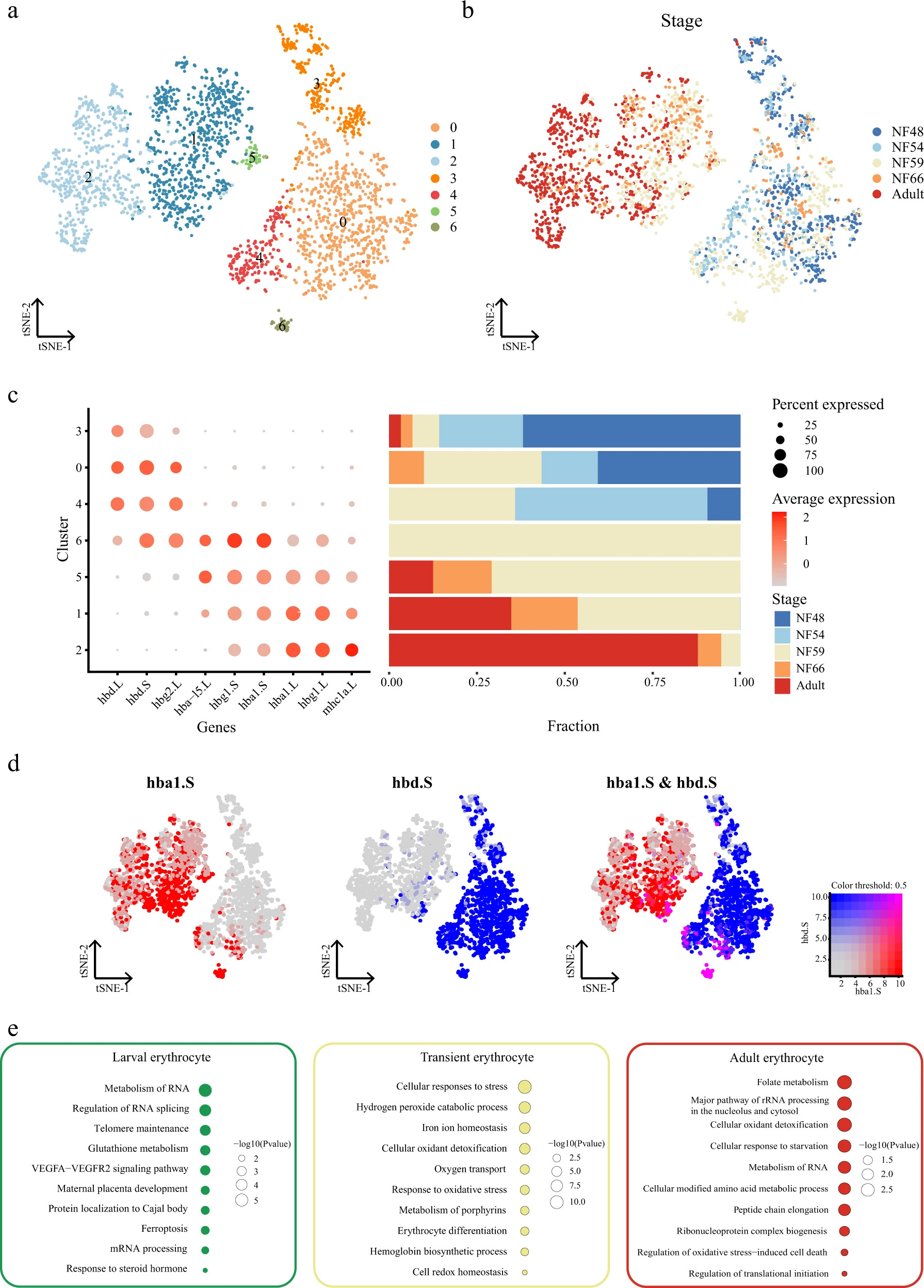 Fig. 5: Conversion of erythrocyte hemoglobin from larva to adult. a t-SNE analysis of erythrocytes collected from larval and adult Xenopus. Different clusters are labeled in different colors. Erythrocytes from adults were sampled to the same order of magnitude as in larva. Cell cluster markers are listed in Supplementary Dataset 3. b t-SNE analysis of erythrocytes collected from larval and adult Xenopus. Different stages are labeled in different colors. c Representative gene expression in each cluster of erythrocytes and cell proportions in different stages are shown. Stages are labeled in different colors. The size of the dot encodes the percentage of cells within a cell type, and the color encodes the average expression level. d Feature plot in the t-SNE map of erythrocytes collected from larval and adult Xenopus. Cells are colored according to the expression of the indicated marker genes hba1.S (red), hbd.S (blue), and co-expression hba1.S and hbd.S (pink). e Representative GO terms enriched in each module for three cell types. Different cell clusters are labeled in different colors. P value was calculated by the hypergeometric distribution, a statistical test is one-sided, adjustments P values were made after P value is corrected by BenjaminâHochberg multiple test. |