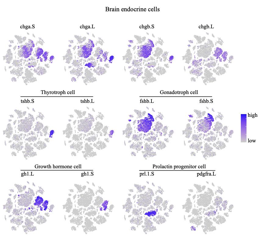 Supplementary Figure 2. Representative gene expression in endocrine cells of the Xenopus brain. Feature plot in the t-SNE map of adult Xenopus brain single-cell data. Kinds of endocrine cells are colored according to the expression of the indicated marker genes: co- expressed high levels of chga and chgb but different hormone-associated genes. |