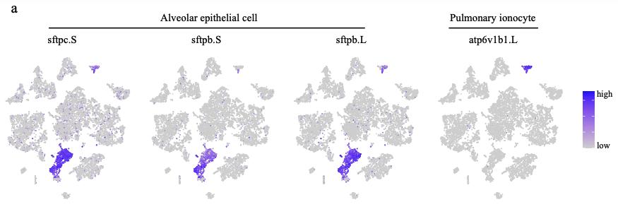Supplementary Figure 3. [ panel a] Details of cellular heterogeneity in adult Xenopus lung. a, Feature plot in the t-SNE map of adult Xenopus lung single-cell data. Cells are colored according to the expression of the indicated marker genes. b, Sankey plot showing the relationships among the Xenopus lung, mouse lung, zebrafish gill and swim bladder. Different cell clusters in each species are marked in different color boxes. |