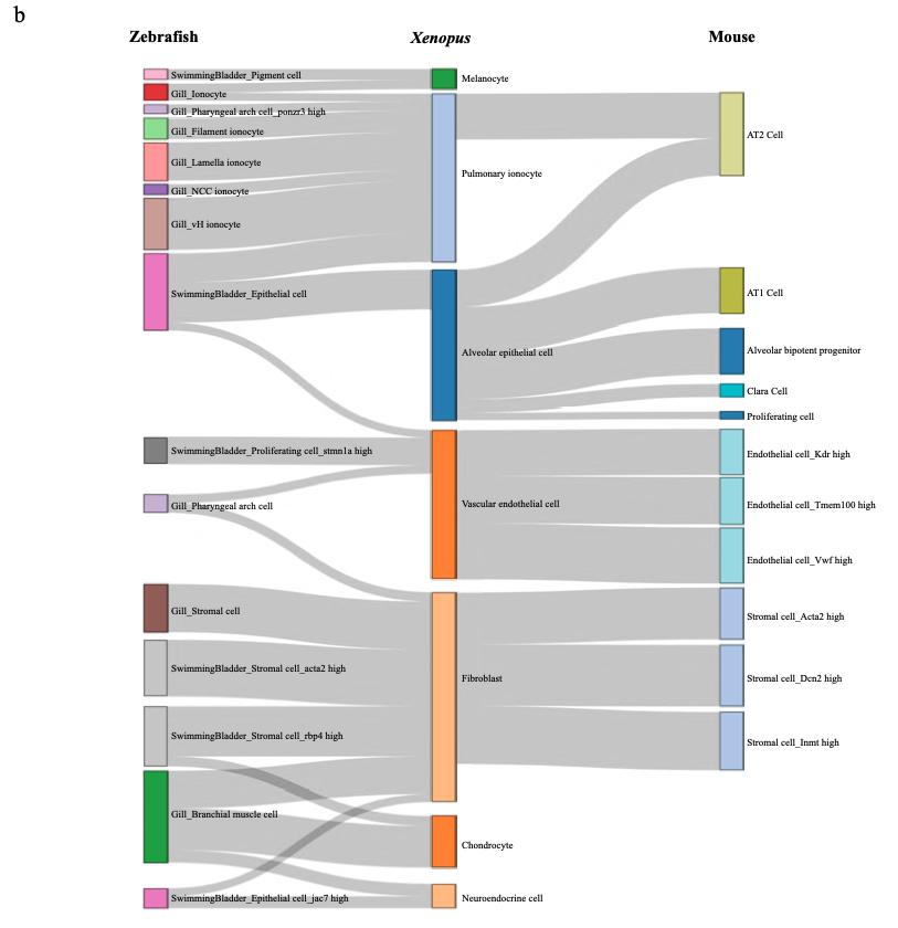 Supplementary Figure 3. [panel b] Details of cellular heterogeneity in adult Xenopus lung. a, Feature plot in the t-SNE map of adult Xenopus lung single-cell data. Cells are colored according to the expression of the indicated marker genes. b, Sankey plot showing the relationships among the Xenopus lung, mouse lung, zebrafish gill and swim bladder. Different cell clusters in each species are marked in different color boxes. |