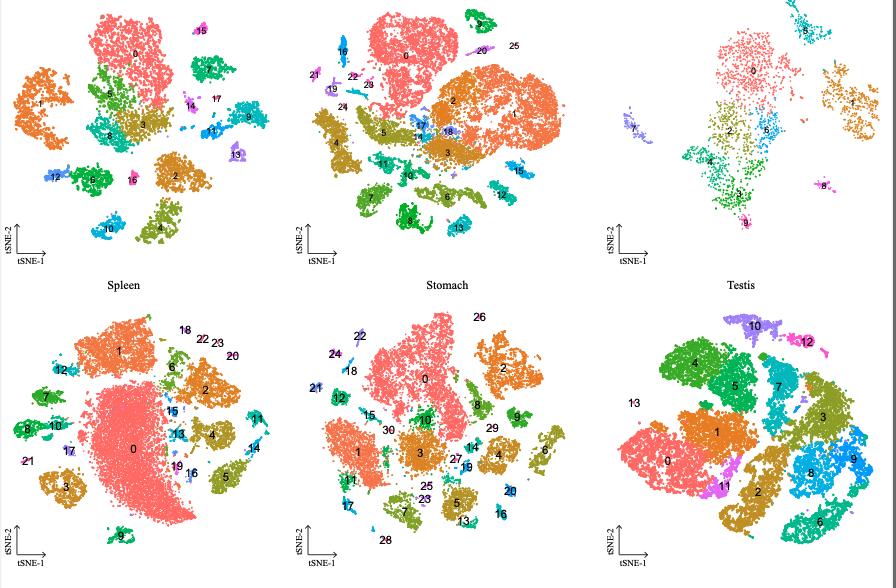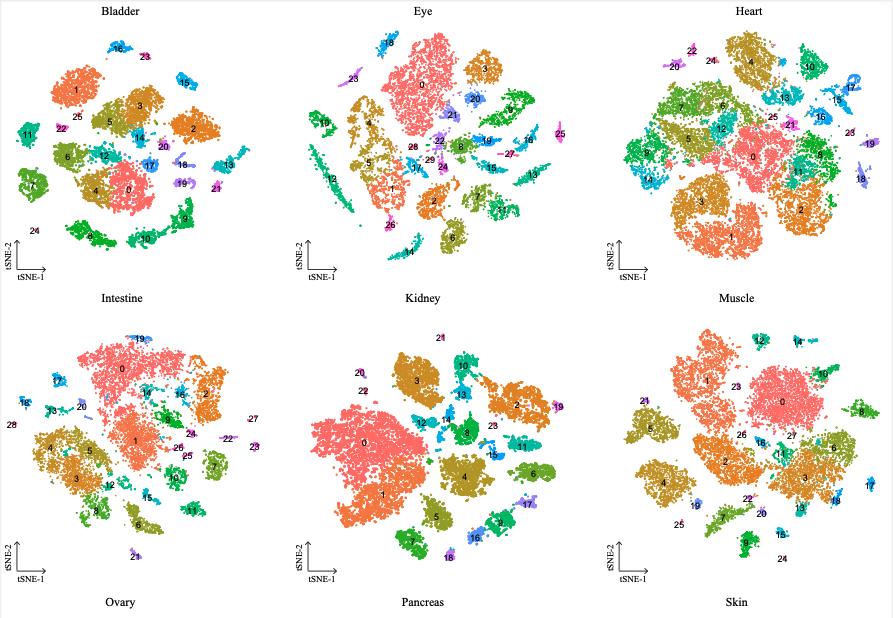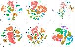 Supplementary Figure 5. [bottom 6 panels] t-SNE analysis of XCL tissues collected from adult Xenopus. t- SNE maps of single-cell data from bladder, eye, heart, intestine, kidney, muscle, ovary, pancreas, skin, spleen, stomach and testis. Cells are colored by cell-type cluster. |