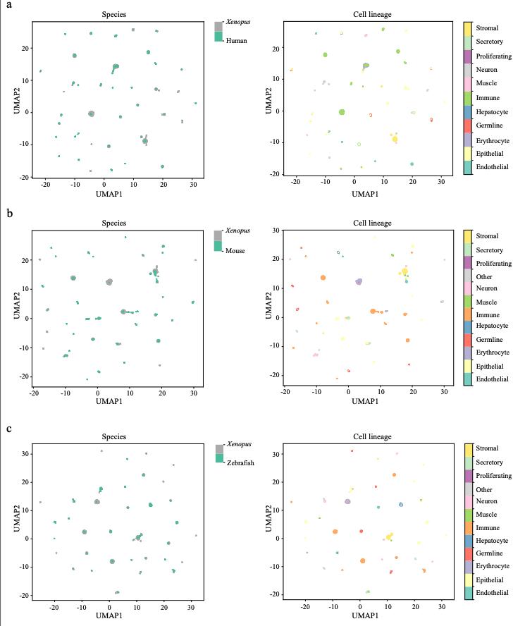 Supplementary Figure 6. The UMAP projection of combined species. The UMAP projection of the combined human and Xenopus (a), mouse and Xenopus (b), zebrafish and Xenopus (c) manifolds are visualized, colored by species (left) and lineages (right) respectively. Cells are colored by cell-type cluster. |