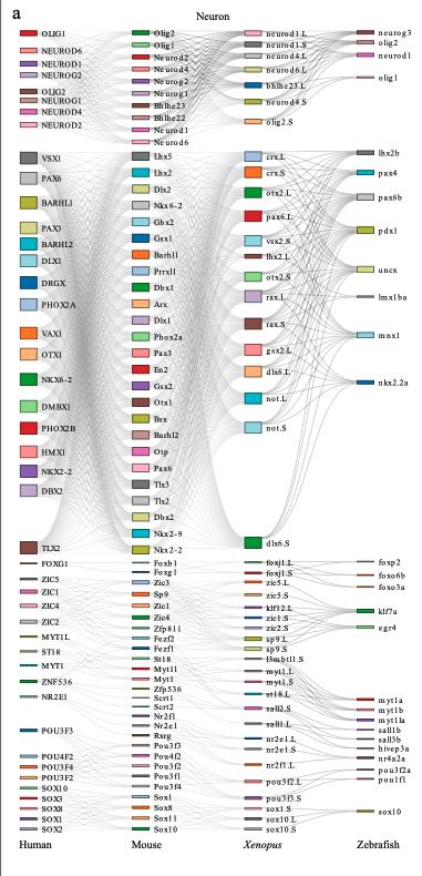 Supplementary Figure 8. [panel a neuronal] The common lineage-specific TFs for each lineage. Sankey plot showing common lineage-specific TFs in neuron (a), muscle (b) and stromal (c). Different TFs in each species are marked in different color boxes. Homologous TFs between species obtained from SAMap are connected by lines. |