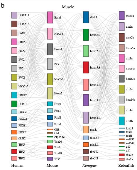 Supplementary Figure 8. [panel b muscle] The common lineage-specific TFs for each lineage. Sankey plot showing common lineage-specific TFs in neuron (a), muscle (b) and stromal (c). Different TFs in each species are marked in different color boxes. Homologous TFs between species obtained from SAMap are connected by lines. |