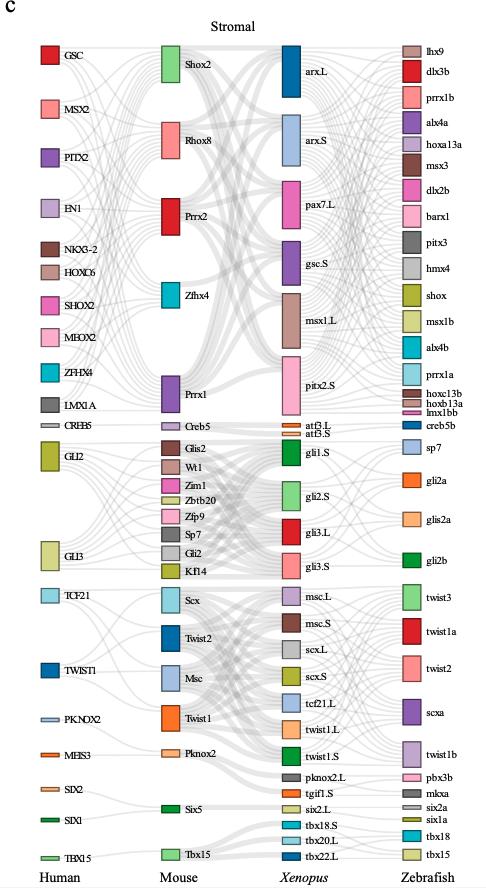 Supplementary Figure 8.[panel c stromal] The common lineage-specific TFs for each lineage. Sankey plot showing common lineage-specific TFs in neuron (a), muscle (b) and stromal (c). Different TFs in each species are marked in different color boxes. Homologous TFs between species obtained from SAMap are connected by lines. |