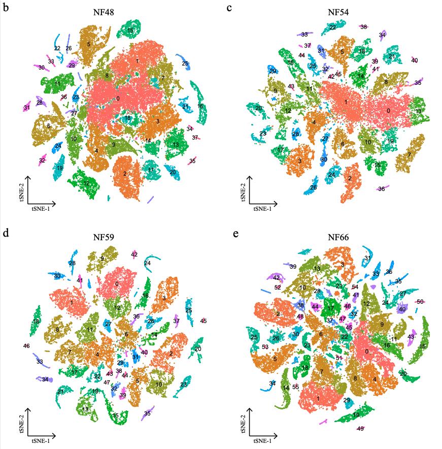 Supplementary Figure 9. [panels b c d e] Details of the constructed larval Xenopus cell atlas during metamorphosis. a, Dot plot showing representative gene expression in each cluster of larval Xenopus during metamorphosis. The size of the dot encodes the percentage of cells within a cell type, and the color encodes the average expression level. b-e, t-SNE analysis of four tadpole stages collected to represent larval Xenopus. Cells are colored by cell-type cluster. |