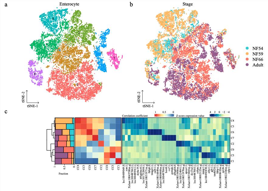 Supplementary Figure 11. [panels a b c] The correlation between larval and adult cell types. t-SNE maps of single-cell data from larval and adult enterocytes (a) and stomach parietal cells (d). Cells are colored by cell-type cluster; t-SNE maps of single-cell data from larval and adult enterocytes (b) and stomach parietal cells (e). Cells are colored by stage. Heatmap showing representative gene expression and correlation of larval and adult enterocytes (c) and stomach parietal cells (f). AUROC scores were used to measure the similarity of cell types: red, high correlation; blue and yellow, low correlation, based on the Spearman correlation. The stacked bar plots illustrate the proportion of clusters. Stage is marked by different colors same as b and d, respectively. |