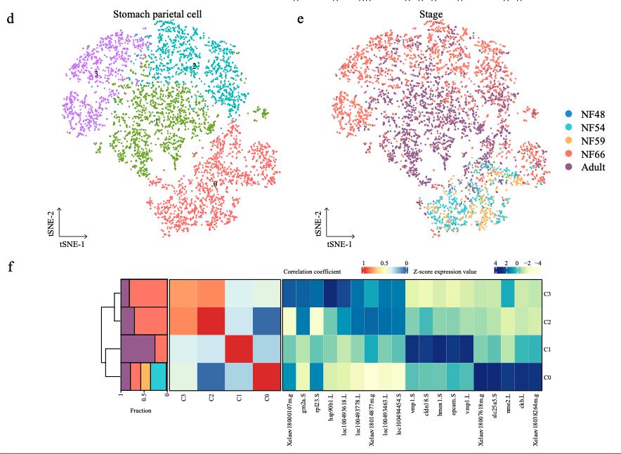 Supplementary Figure 11. [panels d e f] The correlation between larval and adult cell types. t-SNE maps of single-cell data from larval and adult enterocytes (a) and stomach parietal cells (d). Cells are colored by cell-type cluster; t-SNE maps of single-cell data from larval and adult enterocytes (b) and stomach parietal cells (e). Cells are colored by stage. Heatmap showing representative gene expression and correlation of larval and adult enterocytes (c) and stomach parietal cells (f). AUROC scores were used to measure the similarity of cell types: red, high correlation; blue and yellow, low correlation, based on the Spearman correlation. The stacked bar plots illustrate the proportion of clusters. Stage is marked by different colors same as b and d, respectively. |