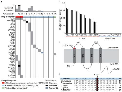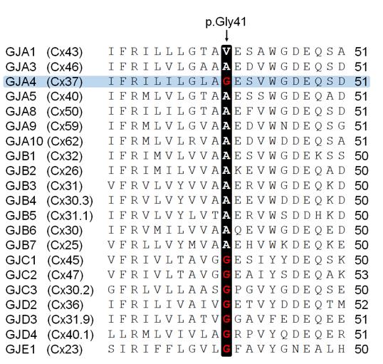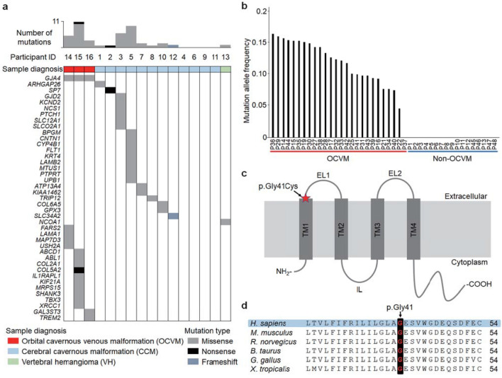Fig. 1. Identification of GJA4 c.121G > T (p.Gly41Cys) in OCVM tissues. a Mutational profiles of vascular anomalies in the discovery cohort. Gene names on the left belong to genes in which somatic mutations were detected. Colored cells represent somatically mutated genes, and color denotes mutation type. b MAF of GJA4 c.121G > T (p.Gly41Cys) was determined using ddPCR analysis in tissue samples from the discovery and validation cohorts. c Position of GJA4 c.121G > T (p.Gly41Cys) in GJA4 (NP_002051.2). TM, transmembrane; EL extracellular loop, IL intracellular loop. d Conservation of Gly41 position in GJA4 orthologs. H. sapiens, human (NP_002051.2); M. musculus, mouse (NP_032146.1); R. norvegicus, rat (NP_067686.1); B. taurus, cattle (NP_001077207.1); G. gallus, chicken (NP_996867.3); X. tropicalis, western clawed frog (NP_001072904.1). Sequence alignments, CLUSTALW