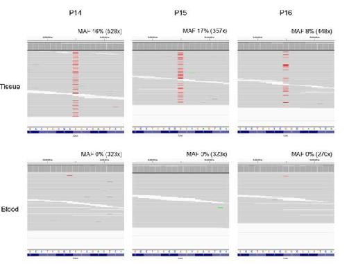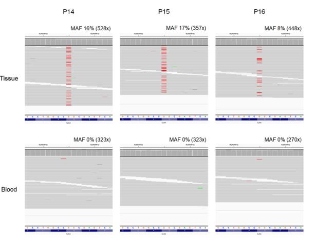 Fig. S1 Integrative Genomic Viewer screenshots showing targeted deep sequencing reads of 3 orbital cavernous venous malformation (OCVM) participants across the area of GJA4 c.121G>T (p.Gly41Cys). Upper and lower columns show images of tissue samples and blood samples, respectively. Variant nucleotides (T) are shown in red. The reference nucleotide and amino acid sequences are at the bottom. Participant IDs are shown above. The mutation allele frequencies (MAFs) and sequencing coverages at the position are shown above each image