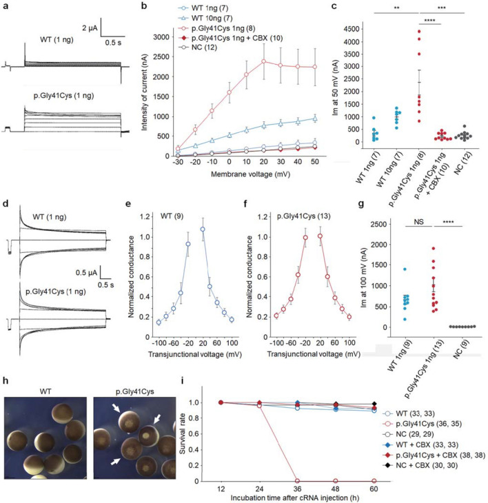 Fig. 3. GJA4 p.Gly41Cys increases GJA4 hemichannel activity. a Representative whole-cell voltage clamp hemichannel-recording of Xenopus oocytes injected with 1 ng of GJA4 WT or GJA4 p.Gly41Cys cRNA. b Intensity of hemichannel currents at the steady state plotted as a function of membrane voltage. The number of oocytes analyzed is given in parentheses. Data are shown as means ± SEM. c Comparison of hemichannel currents at a steady state of 50 mV membrane voltage. Data are shown as means ± SEM. d Representative whole-cell voltage clamp gap junction-recording of Xenopus oocytes injected with 1 ng GJA4 WT or GJA4 p.Gly41Cys cRNA. e A plot of normalized steady state junctional conductance versus transjunctional voltage (Gj–Vj plot) for GJA4 WT. The number of oocytes analyzed is given in parentheses. Data are shown as means ± SEM. f Plots of normalized steady state junctional conductance versus transjunctional voltage (Gj–Vj plot) for GJA4 p.Gly41Cys. The number of oocytes analyzed is given in parentheses. Data are shown as means ± SEM. g Comparison of transjunctional current at a steady state of 100 mV membrane voltage. Data are shown as means ± SEM. P value was calculated using a two-tailed t test. h Images showing the deleterious effect of GJA4 on oocytes (arrows) injected with GJA4 c.121G > T (p.Gly41Cys) compared with GJA4 WT 36 h after cRNA injections. i Plots of survival rates of oocytes injected with GJA4 WT and c.121G > T (p.Gly41Cys). The number of oocytes analyzed is given in parentheses. The averages of two replicated experiments were plotted. P values were calculated using a two-tailed t test. NS not significant; *p < 0.05; **p < 0.01; ***p < 0.001; ****p < 0.0001