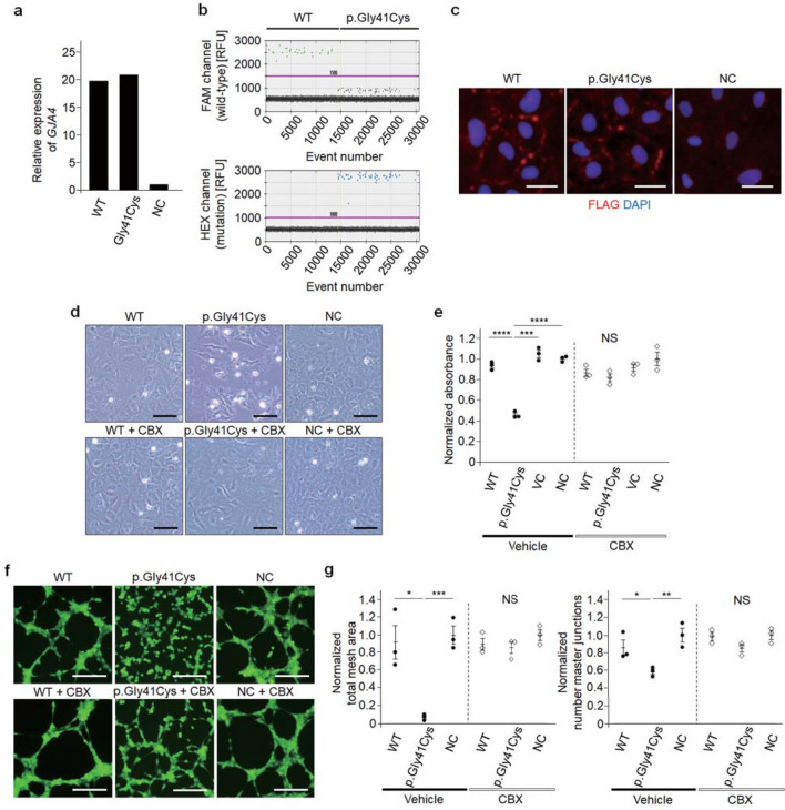 Fig. 4. GJA4 p.Gly41Cys dysregulates endothelial cell-function, which is rescued by a connexin inhibitor. a qPCR analyses of GJA4 mRNA in HUVECs transfected with GJA4 WT or GJA4 c.121G > T (p.Gly41Cys). b ddPCR analysis of GJA4 cDNA in HUVECs transfected with GJA4 WT or GJA4 c.121G > T (p.Gly41Cys). Each dot represents a droplet, with blue being mutation positive, and green being wild-type positive. c Immunostaining for FLAG and nuclear marker DAPI of HUVECs transfected with GJA4 WT-FLAG, GJA4 c.121G > T (p.Gly41Cys)-FLAG, or normal control. Scale bars, 15 μm. d Representative image of HUVECs transfected with GJA4 WT, GJA4 c.121G > T (p.Gly41Cys), or normal control, and efficacy of CBX. Scale bars, 50 μm. e Quantification of cell viability of HUVECs transfected with GJA4 WT, GJA4 c.121G > T (p.Gly41Cys), vector control, and normal control using the MTT assay. f Representative images of tube formation assay of HUVECs transfected with GJA4 WT, GJA4 c.121G > T (p.Gly41Cys), or normal control, and the efficacy of CBX. Scale bars, 200 μm. g Quantification of tube formation in HUVECs transfected with GJA4 WT, GJA4 c.121G > T (p.Gly41Cys), and normal control by total mesh area (left) and number master junctions (right). P values were calculated using a two-tailed t test. NS, not significant; *p < 0.05; **p < 0.01; ***p < 0.001; ****p < 0.0001