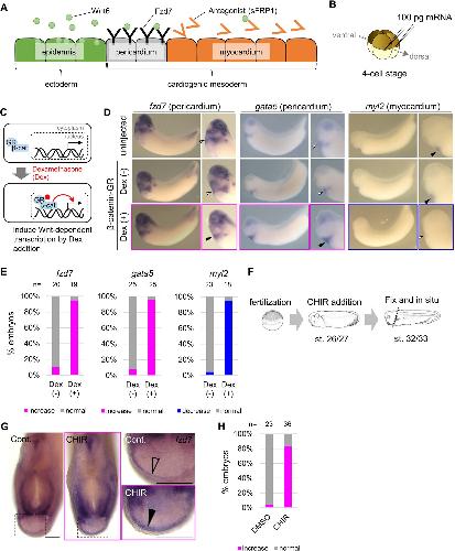 Figure 1. Wnt6/β-catenin signaling induces fzd7 expression during Xenopus heart development. (A) Schematic figure showing distributions of Wnt6, Fzd7, and sFRP1 in heart development. Wnt6 is secreted from the epidermis (outside the embryo). Its antagonist, sFRP1, is secreted from prospective myocardium (inside the embryo). Expression of the Wnt receptor, Fzd7 becomes localized to the pericardium region as in Figure 1âfigure supplement 1B. The pericardial cavity will subsequently form between the pericardium and the myocardium. (BâE) β-catenin activation increased fzd7 expression. mRNA encoding an inducible β-catenin protein (β-catenin fused with the hormone-binding domain of the human glucocorticoid receptor (GR)) was injected into two dorsal blastomeres at the four-cell stage (B). The GR-fused protein can be translocated into the nucleus with dexamethasone (Dex) and induces Wnt/β-catenin signal-dependent transcription (C). Dex addition (β-catenin activation) at the tailbud stage (st.22â23) resulted in an increase in fzd7 and gata5 expression and a decrease in myl2 expression (arrowhead, Dex (+)) (D) as quantified in E (Fisherâs exact test, p=5.8 x 10â8 (fzd7), 1.2 à 10â10 (gata5), 2.1 à 10â9 (myl2)). (FâH) Embryos were treated with a Wnt agonist, CHIR99021 (5 μM; control DMSO) from st. 26/27, just before the onset of Wnt6 expression, to st. 32/33 (F). The fzd7 expression area became broader with CHIR treatment (G, arrowhead), but not in DMSO controls (G, open arrowhead), as quantified in H. Scale bar = 200 μm. |